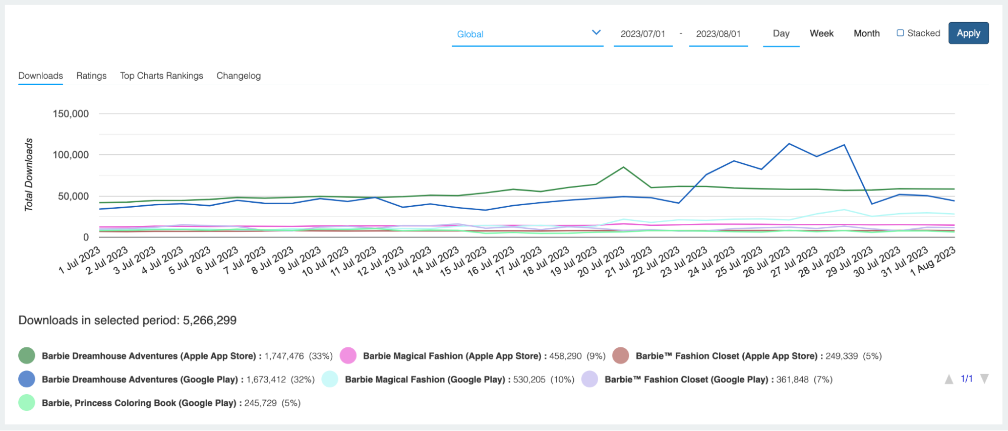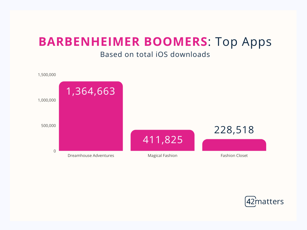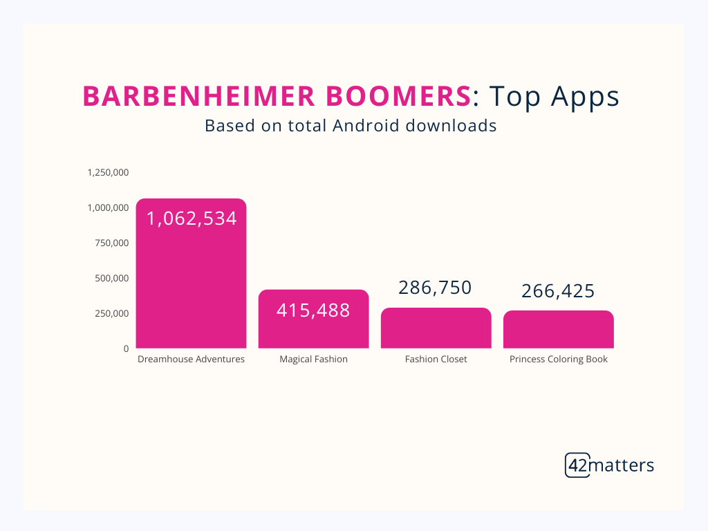 On top of that, it led to a record month for Barbie-themed apps on the Apple App Store and Google Play. Downloads spiked 93% in July, with the top seven apps raking in a whopping 5,266,299 total downloads.