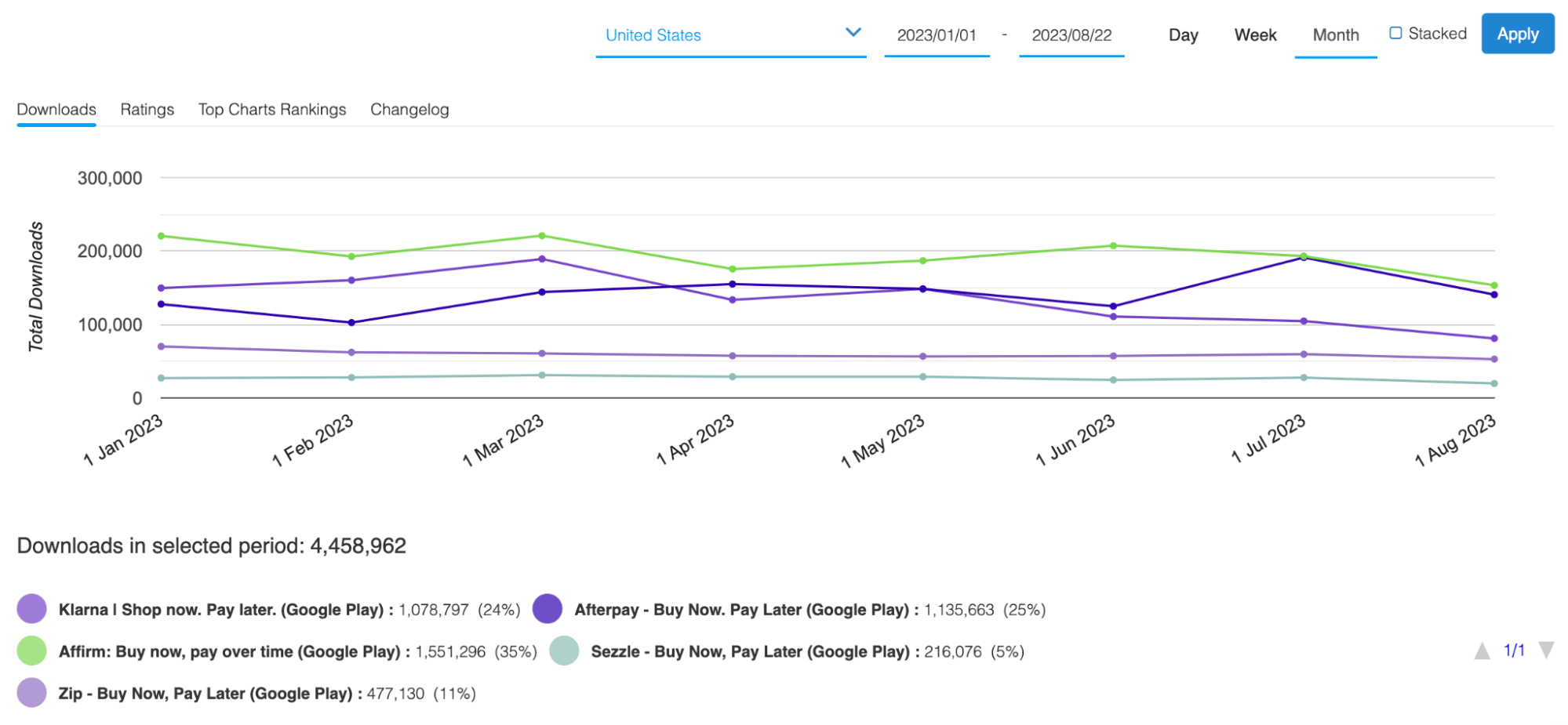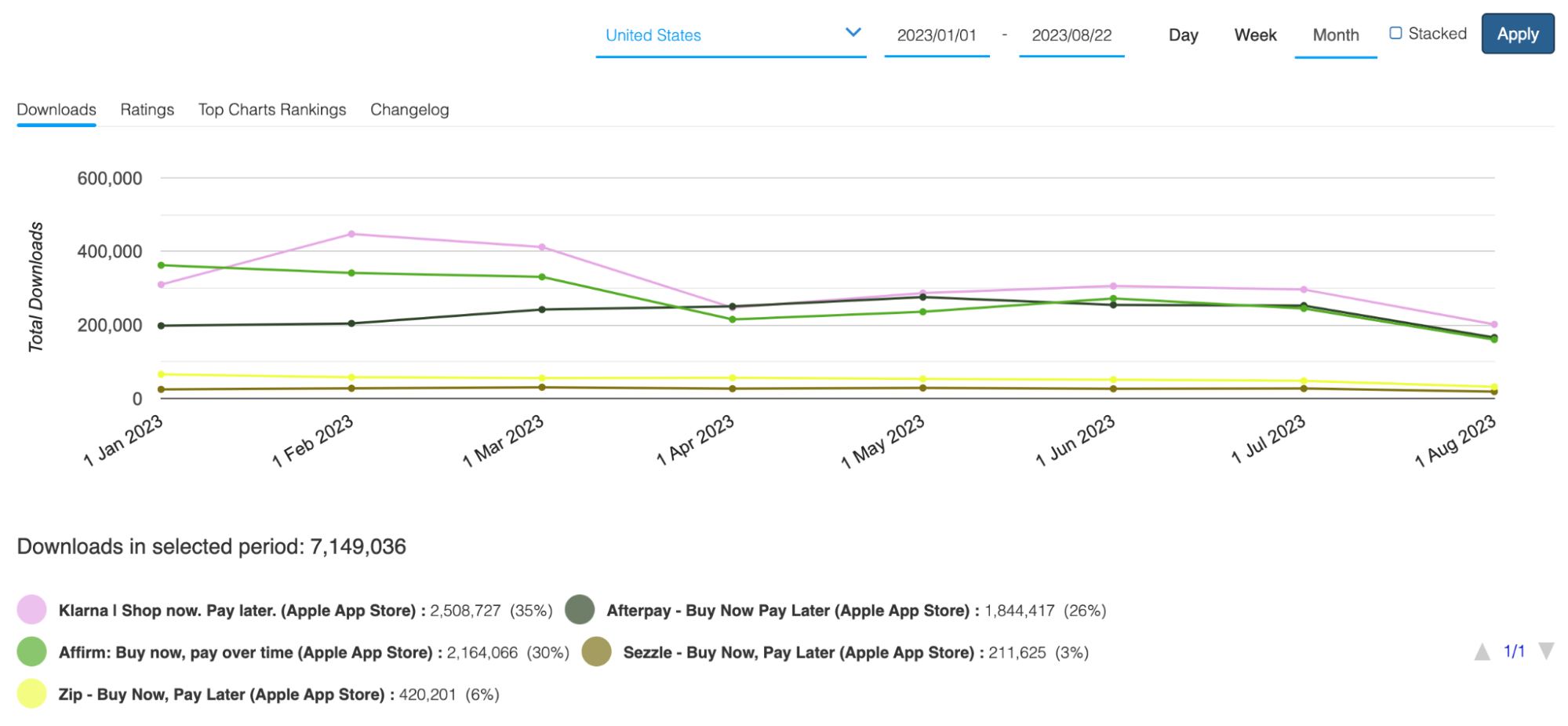 Now for the Android versions of the top BNPL apps. As before, we looked at monthly US downloads through 2023 YTD, so downloads may appear to be down across the board in August due to the fact that the data was collected before the end of the month.
