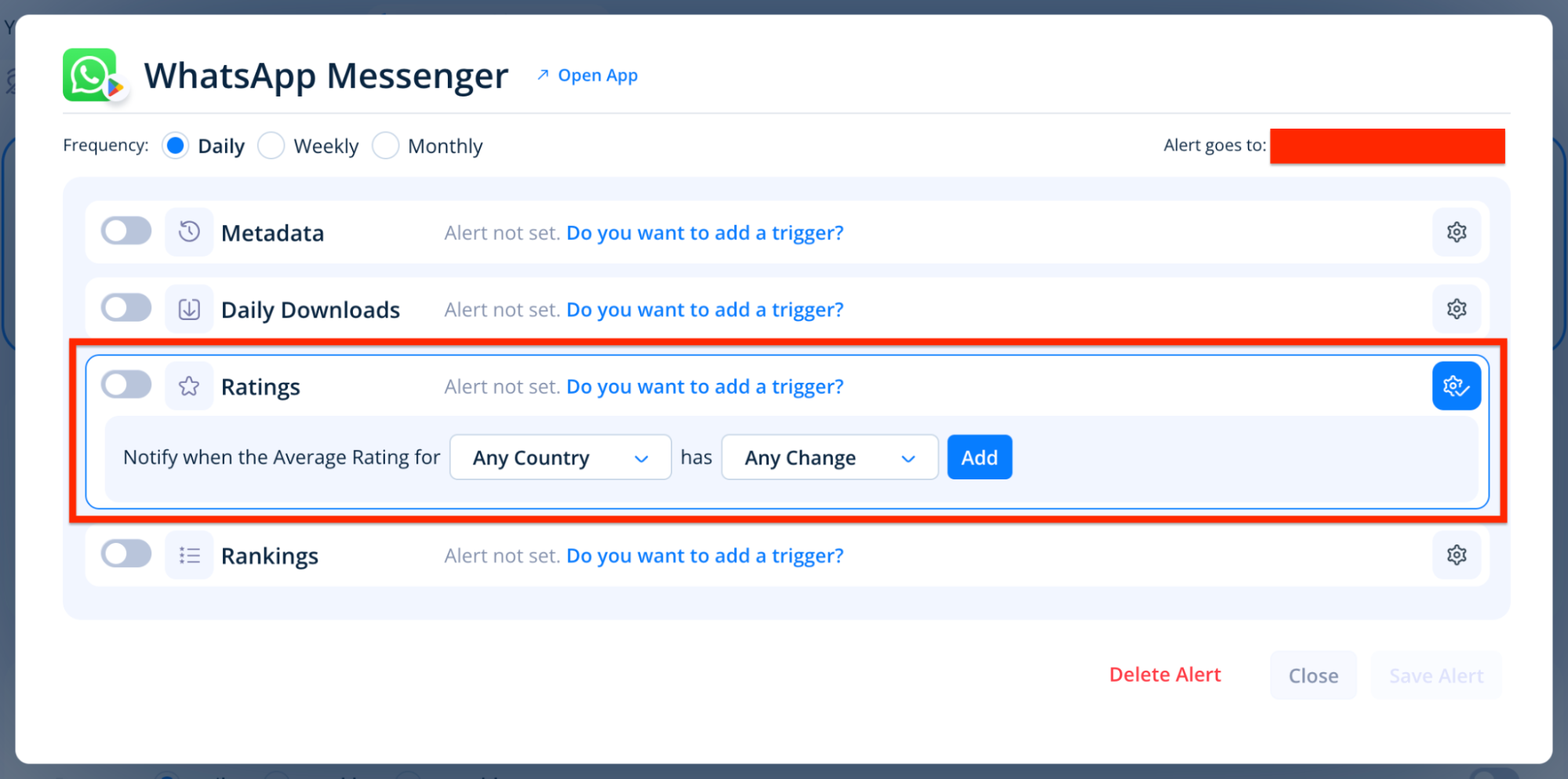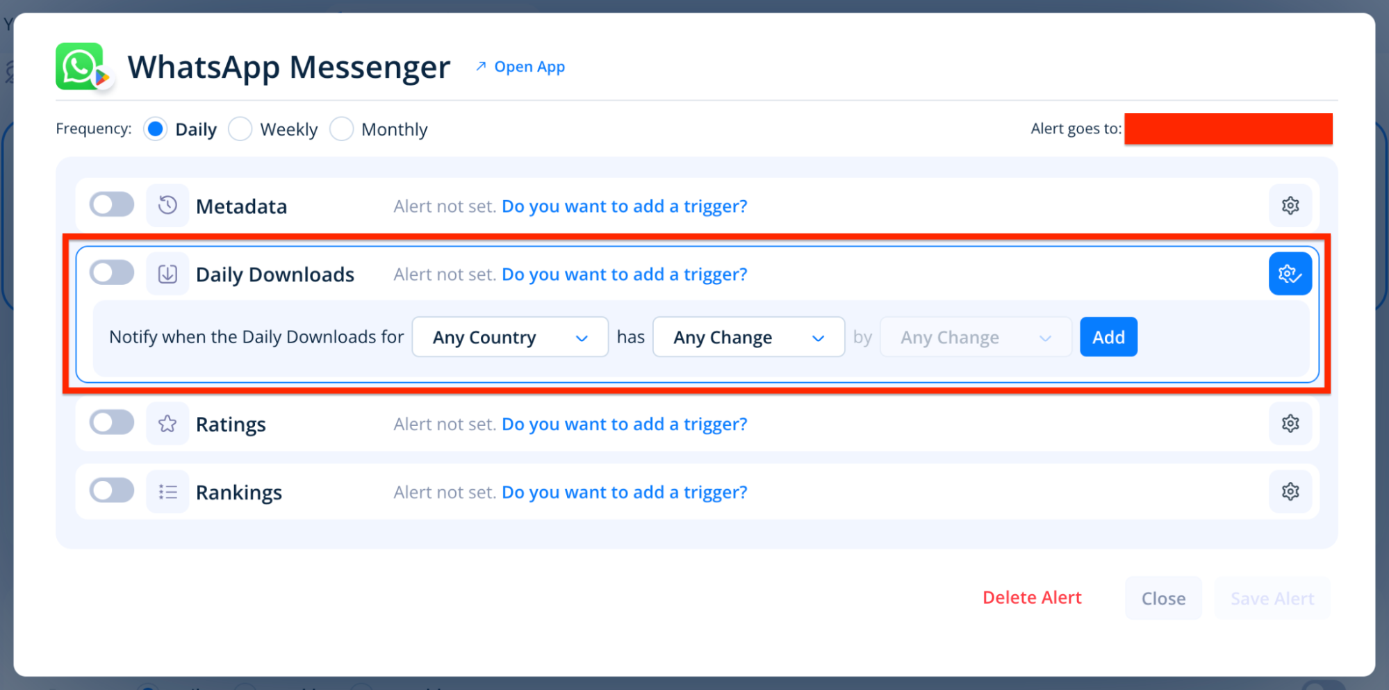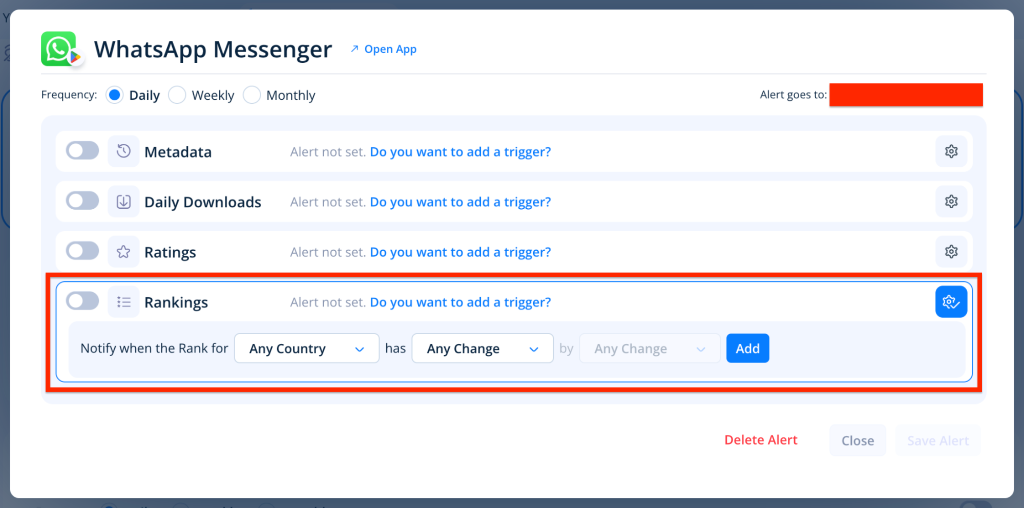 These three sections are all pretty self-explanatory, so we’ll spare you the individual explanations and say simply that you can use these triggers to notify you when an app hits pre-set thresholds for daily downloads, ratings, and rankings.
