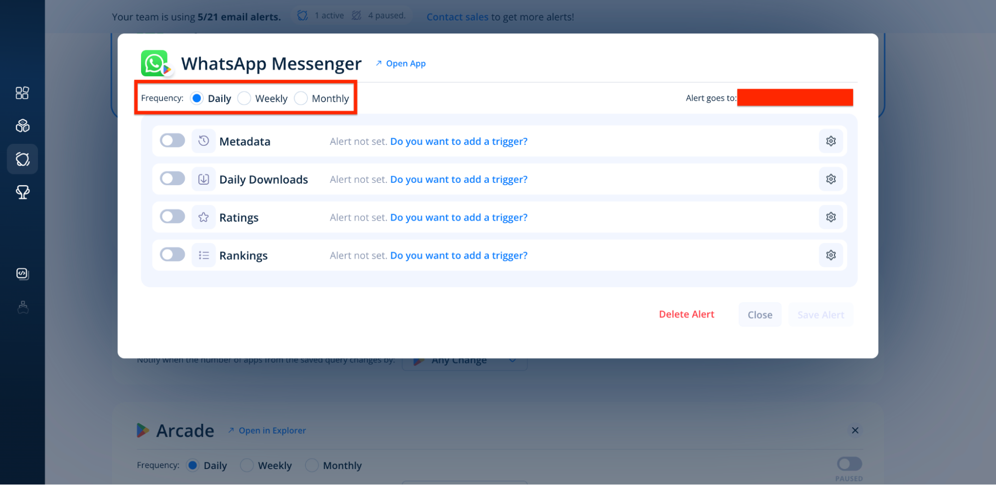 From here, you have a few options. First, you can set the frequency of the Alert. While in general Alerts are triggered by certain events that you would like to monitor—like download thresholds, tech stack updates, etc.—you can set regularized emails to stay in the loop in the meantime.