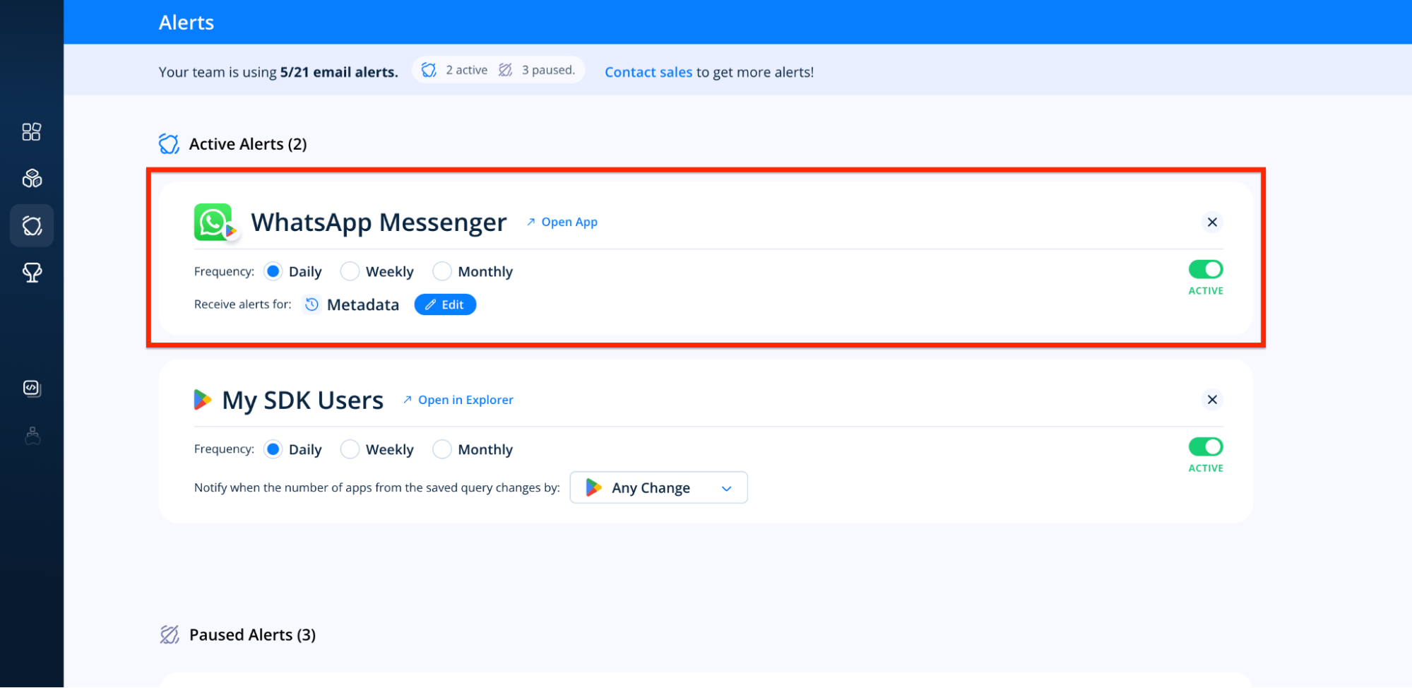 This enables you to keep track of changes to an app’s title, description, category, integrated SDKs, monetization techniques, privacy policy, content ratings, etc. So, if you select SDK, you’ll receive a notification whenever the app changes its tech stack.