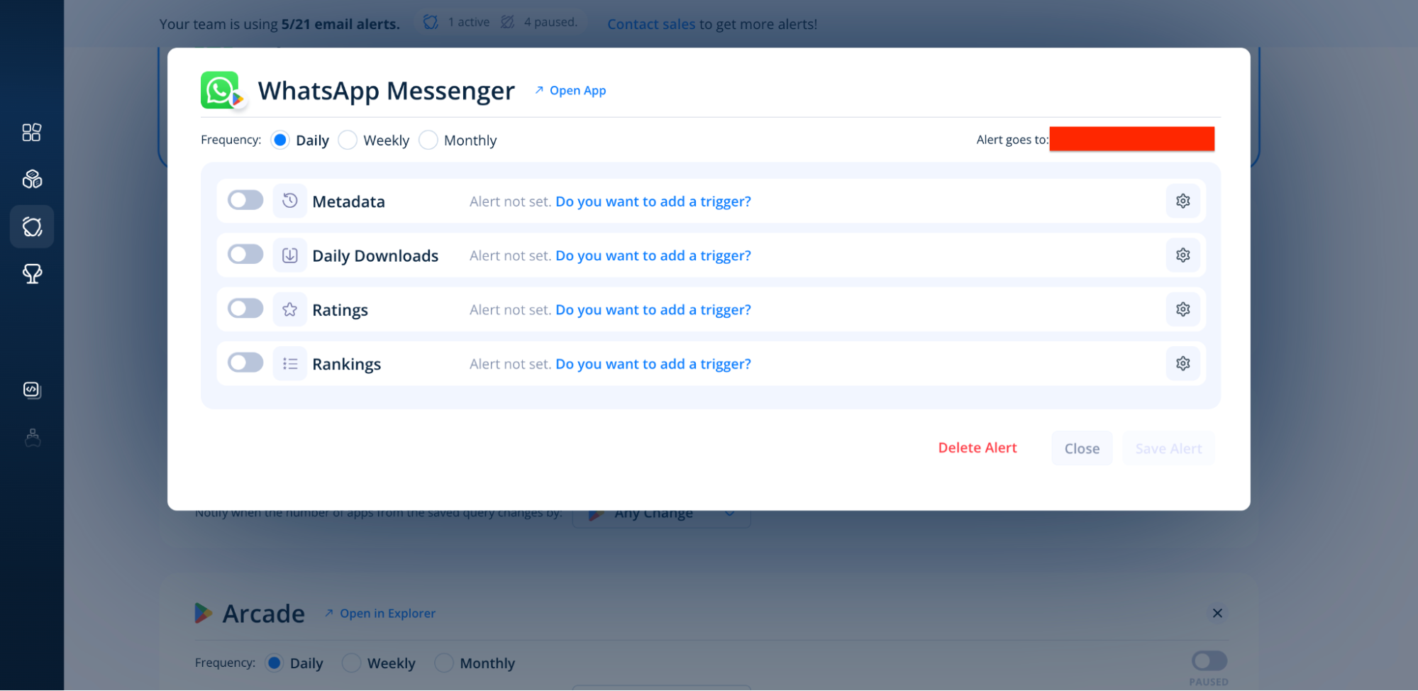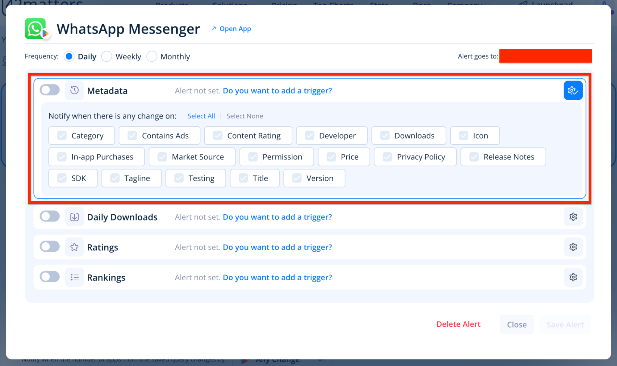 App Alerts are similar to SDK and App Query Alerts. They’re email notifications that you can set up inside the 42matters Explorer to notify you about significant changes to apps that are relevant to your business.