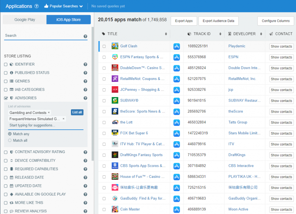 One more thing! The 42matters Explorer provides two additional content advisory filtering options: “Match any” and “Match all.” “Match any” functions as an OR operator, listing all apps that contain any of the advisories you list. The “Match all” option will list all apps that contain all the advisories you include in your filtering.