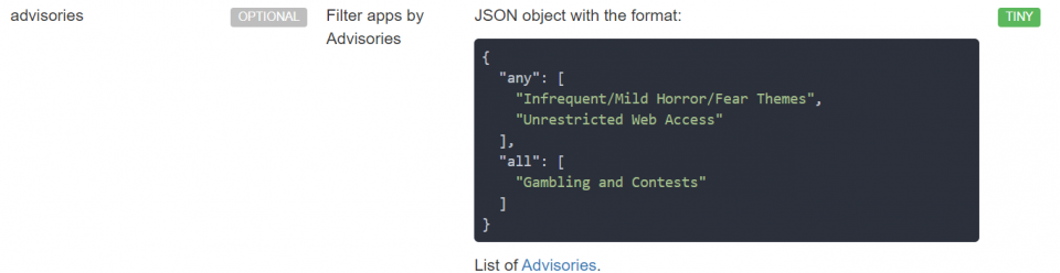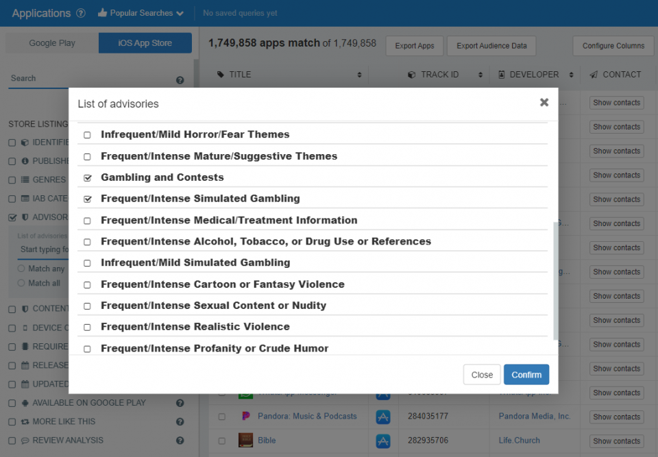 To find apps that use specific content advisories, tick the box next to the advisories of interest in the pop-up. Then click confirm to apply the filter.