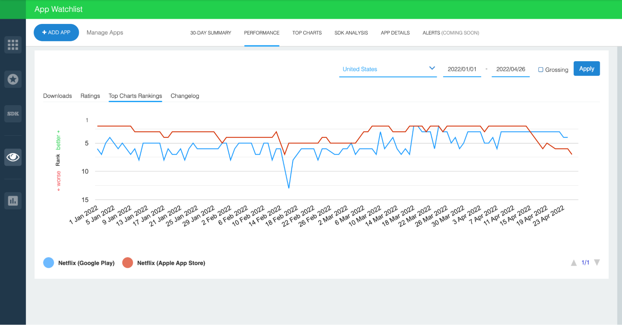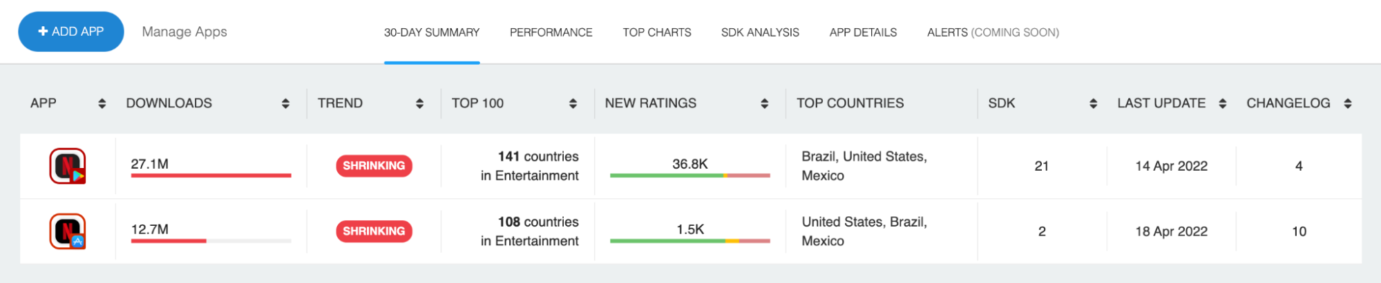 Let’s begin by taking a look at how the Netflix app has performed over the last 30 days. In particular, here’s an overview of the Android and iOS versions of Netflix from between March 27th, 2022 and April 26th, 2022: