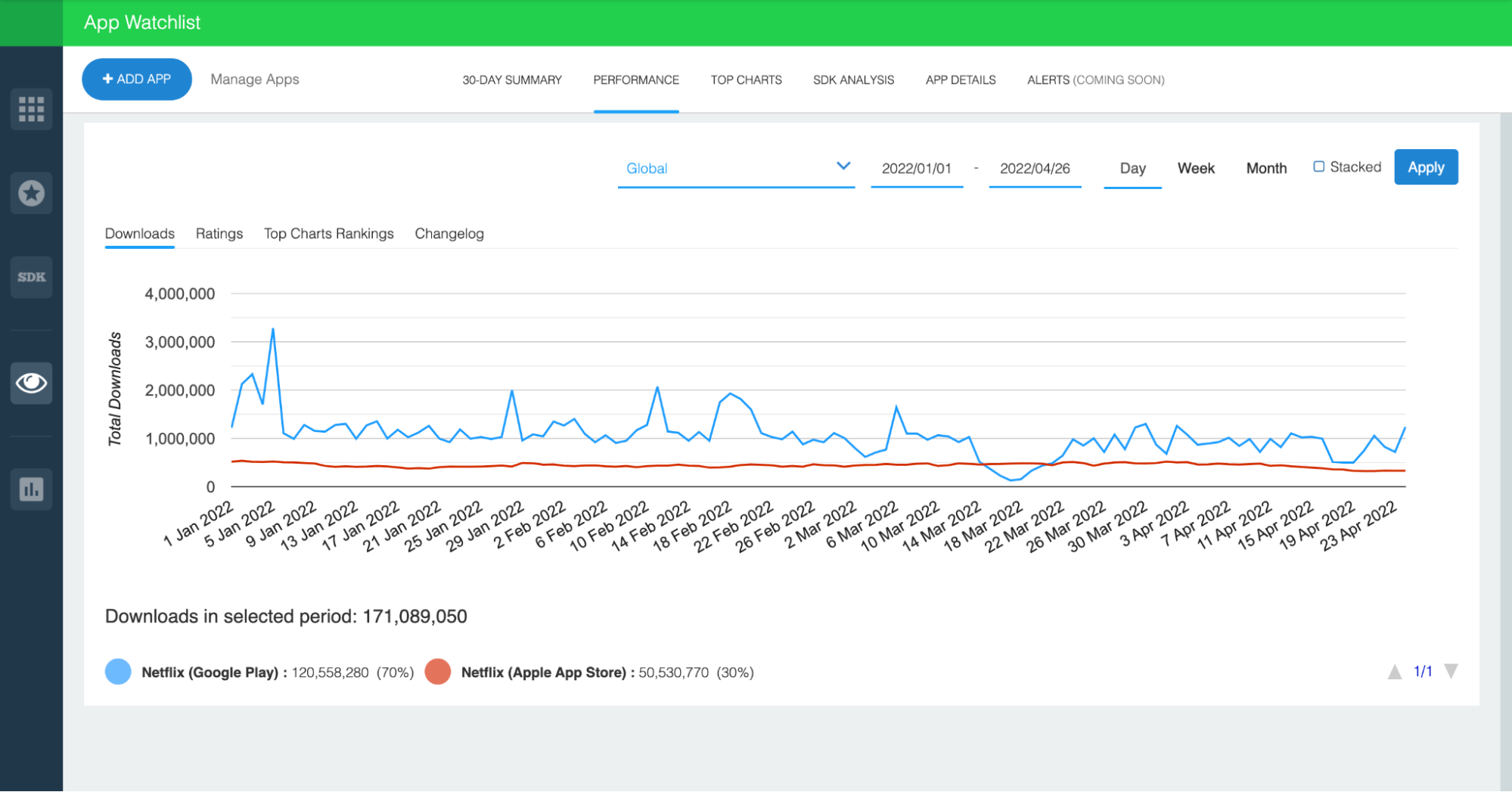 We used our App Watchlist platform to plot Netflix’s daily global downloads between January 1st, 2022 and April 26th, 2022. Here, the Android app is depicted in blue, whereas the iOS app is depicted in red.