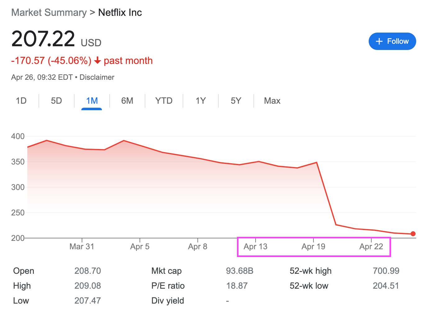 However, relevant to Netflix’s current struggles, there’s a marked decline in daily downloads beginning in mid-April. Not only do iOS downloads begin to dip around April 15th, but the Android version also begins to flatline a bit, with one dramatic trough lasting from April 16th until April 21st. These dates happen to line up fairly well with the company’s stock price trends: