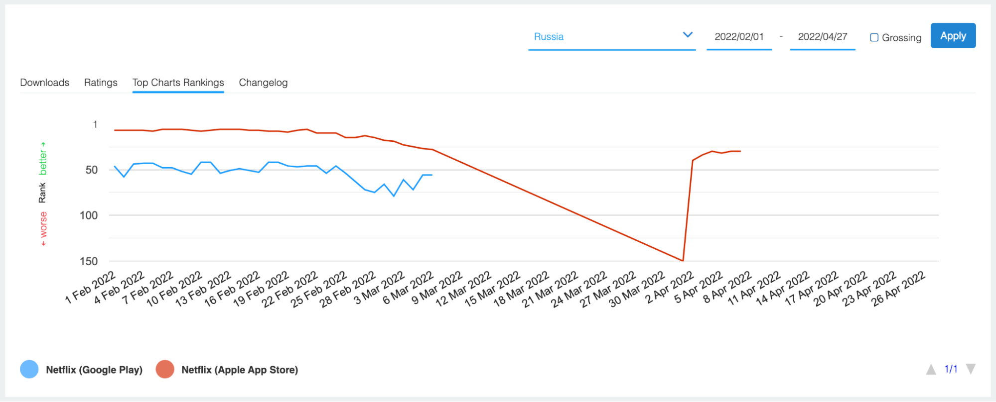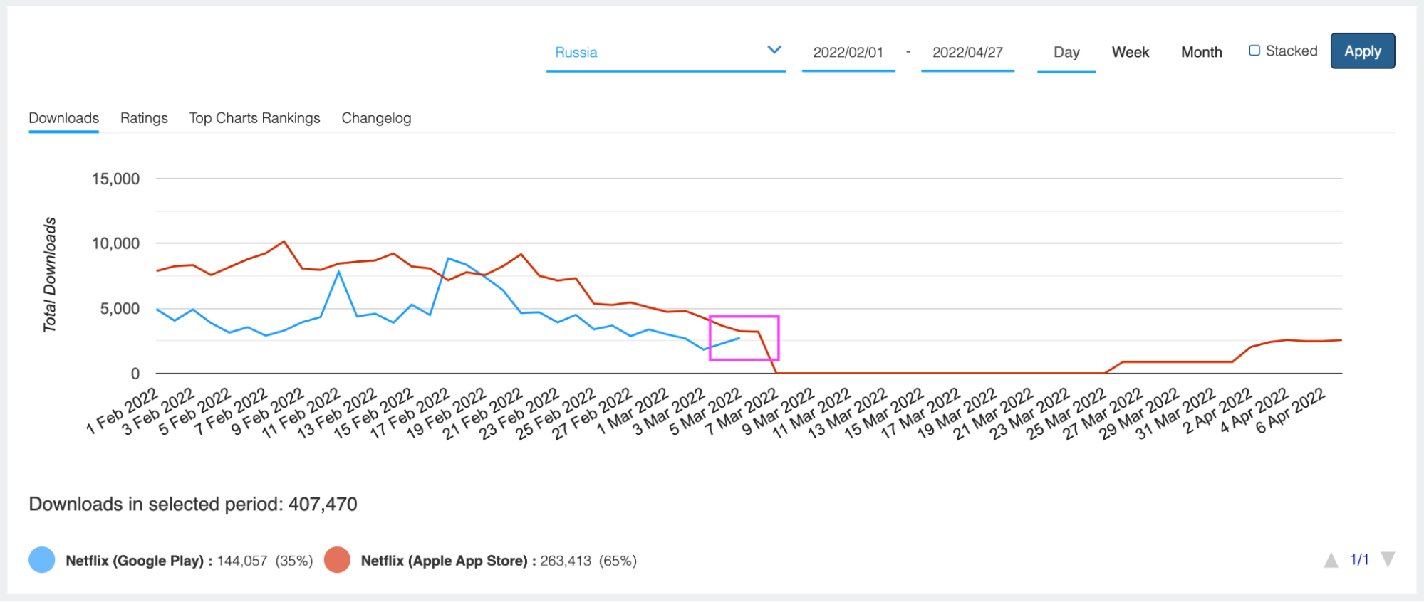 Another interesting thing to note is that Netflix downloads clearly suffered when the company suspended services in Russia. That mid-March dip in Android downloads seems directly tied to the company’s March 6th withdrawal. Check it out, here are Netflix’s daily downloads in Russia between February 1st and April 6th: