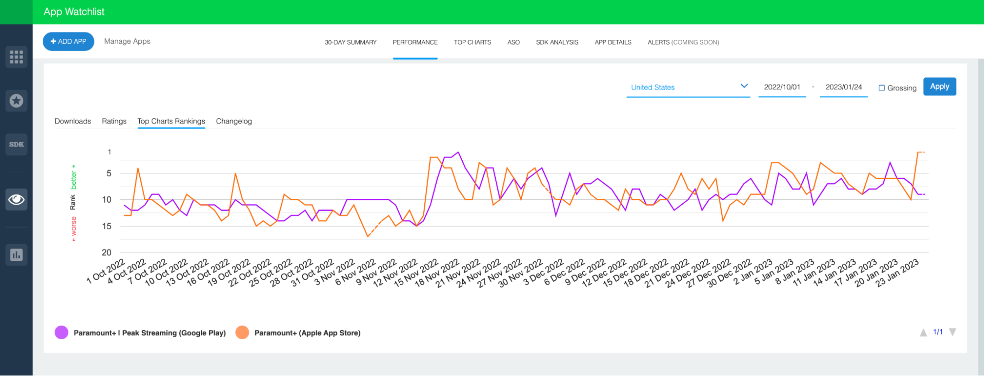 Paramount’s downloads have translated to strong top chart rankings. Currently, the iOS version is the top app in the “Entertainment” genre, while the Android version ranks 9th. However, in the period we looked at, both versions of the app have held the top spot in their respective stores and neither have fallen outside the top 20.