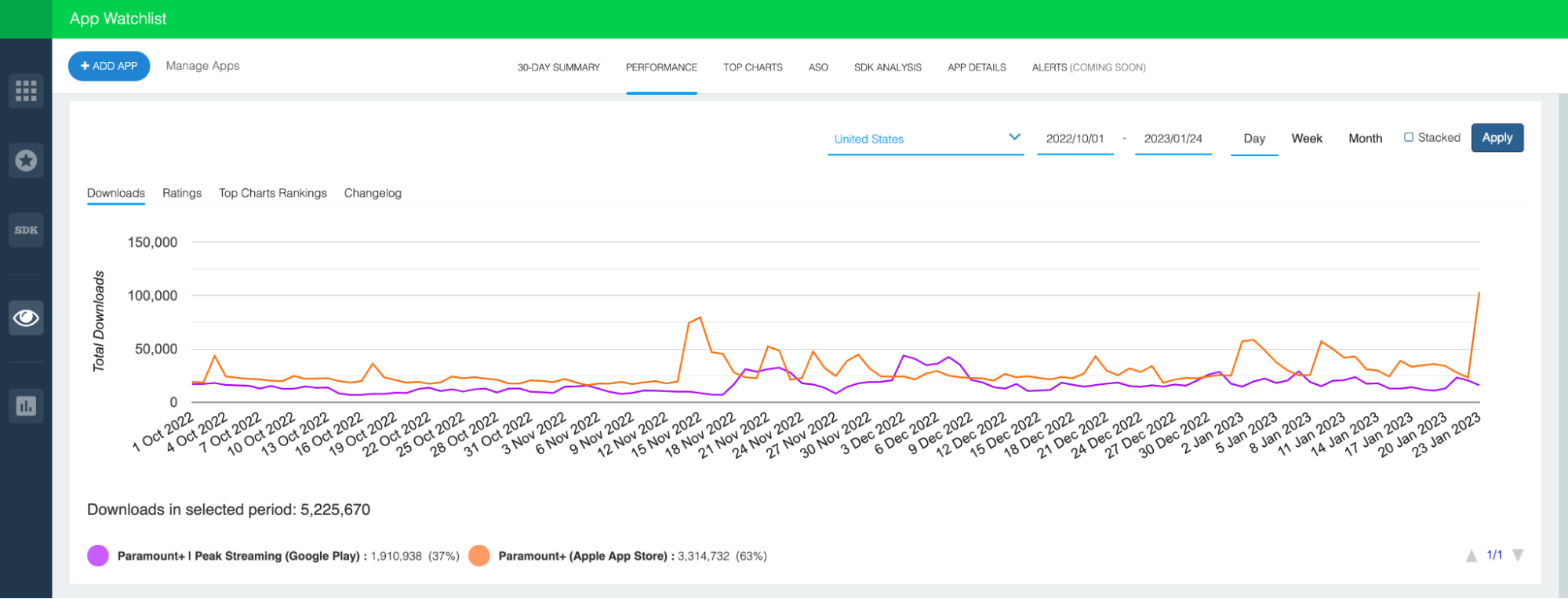 The chart above depicts daily U.S. downloads for the Android (purple) and iOS (orange) versions of Paramount+ since October 1st, 2022.