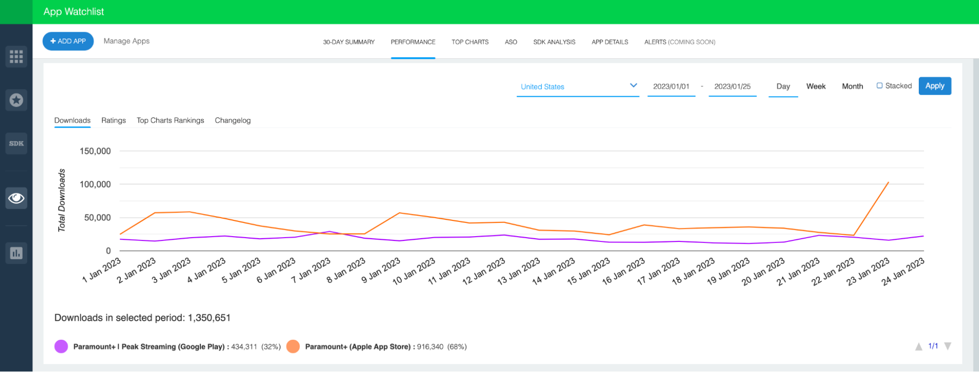 This chart focuses on the period between January 1st, 2023 and January 24th, 2023, when the Paramount+ apps combined for 1,350,651 downloads.