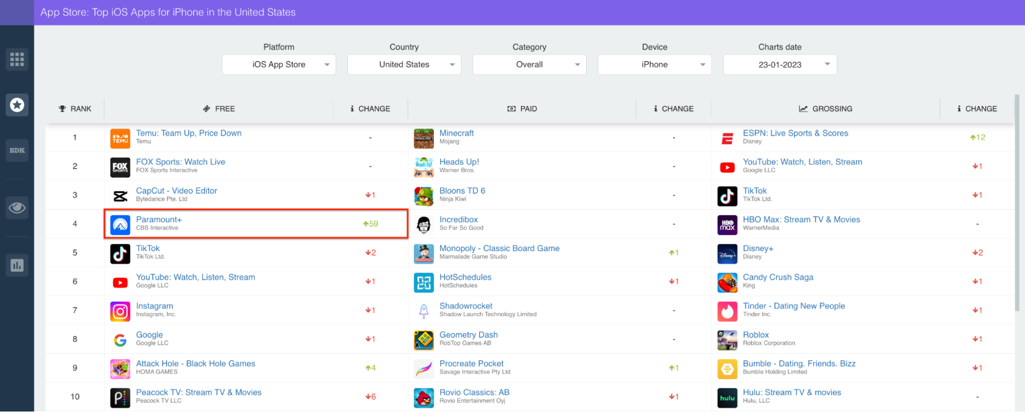 What’s more, the iOS version of Paramount+ rose a whopping 59 spots in the overall U.S. charts, making it the number 4 app in the country on January 23rd, 2023. Amazingly, this was good enough to (briefly) surpass apps like TikTok, YouTube, Instagram, and, well, everyone else. See here: