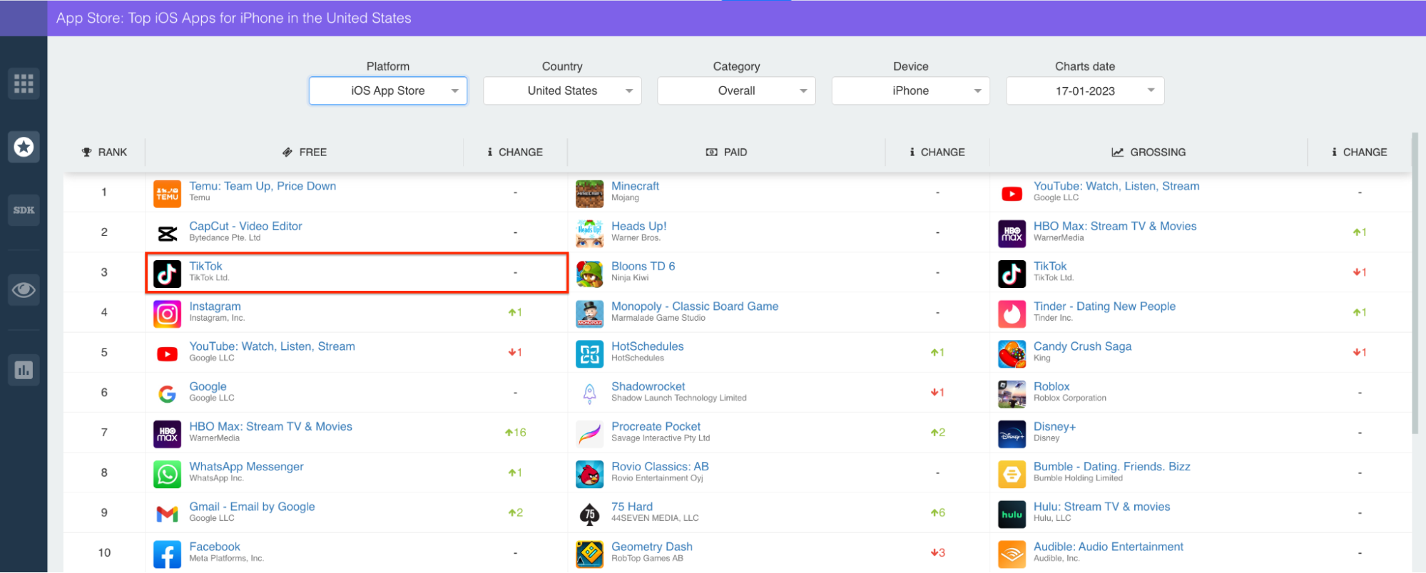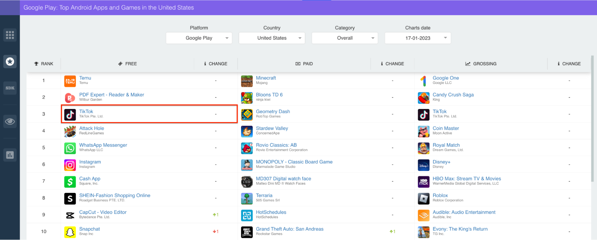 However, TikTok has also performed well outside of category- and genre-specific charts. Currently, it sits at third among all Android and iOS apps in the United States. Check it out: