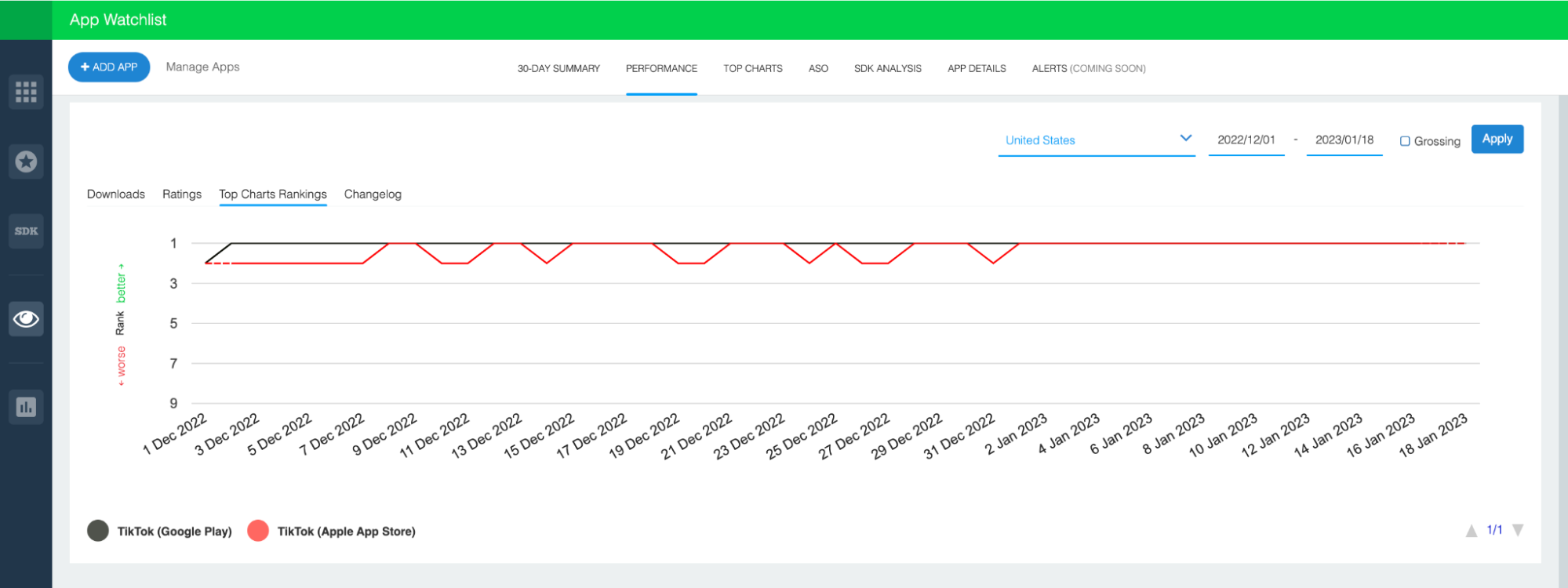 Indeed, the Android version of TikTok, shown in black, has had a stranglehold on the top spot since December 2nd; while the iOS version, shown in red, has fluctuated between first and second since the beginning of December.