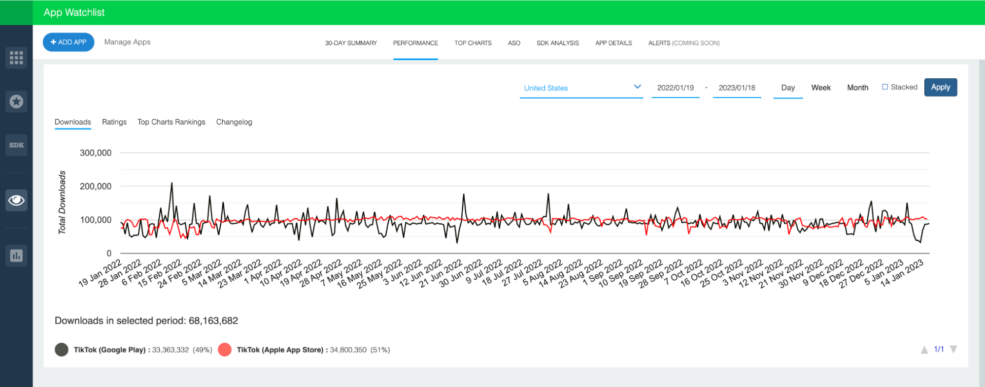 The chart above depicts daily US downloads for the Android (black) and iOS (red) versions of TikTok over the past year (January 19th, 2022 - January 18th, 2023).