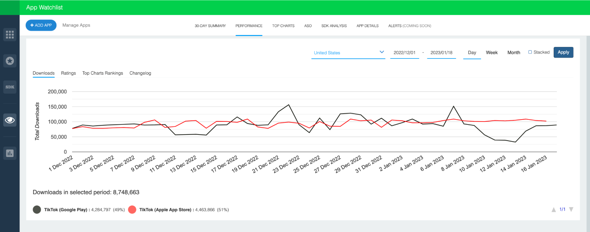 This chart shows the same data as the previous one, but focuses on the period between December 1st, 2022 and January 18th, 2023, when the apps combined for 8,748,663 downloads.