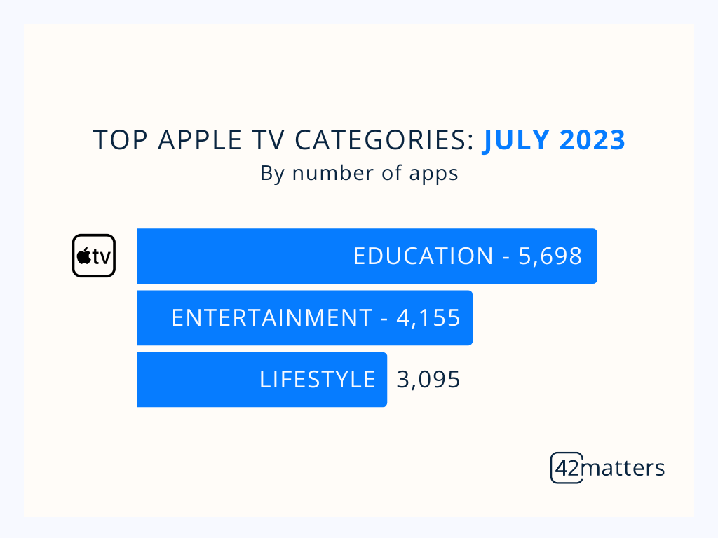 On Apple TV, ‘Education’ leads the way, with 5,698 apps. Then come ‘Entertainment’ (4,155) and ‘Lifestyle’ (3,095).