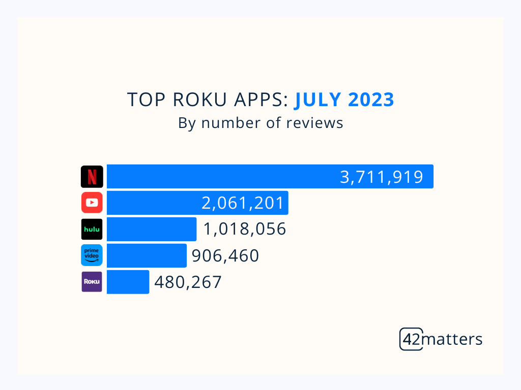 To wrap up, we identified the top CTV apps on the Roku Channel Store based on the number of reviews they’ve received. Currently, Netflix leads the way with 3,711,919 total reviews. The rest of the top five includes household names, like YouTube (2,061,201 reviews), Hulu (1,018,056), Prime Video (906,460), and the Roku Channel (480,267).