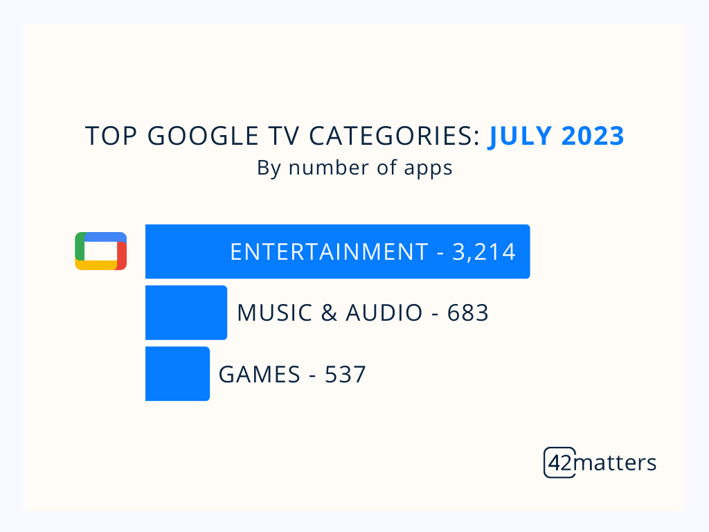 Finally, on Google TV, ‘Entertainment’ is far and away the top category, with 3,214 apps. The Top three is rounded out by ‘Music & Audio’ (683) and ‘Games’ (537).