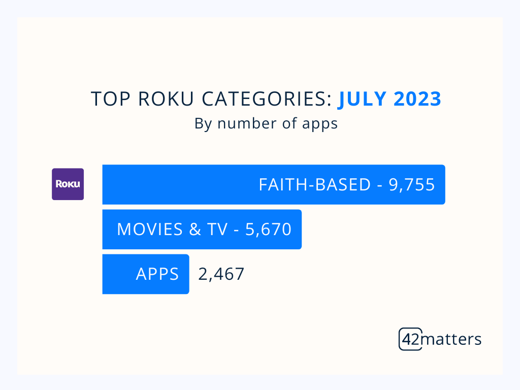 As noted above, the largest category on Roku is ‘Faith-Based’, with ‘Movies & TV’ (5,670 apps) and ‘Apps’ (2,467) rounding out the top three.