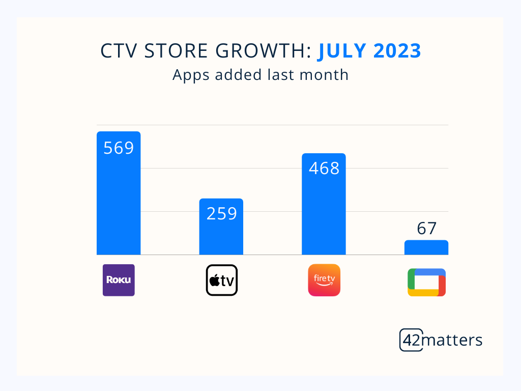 Not only is the Roku Channel Store the largest CTV app store, it’s also the fastest growing. Indeed, 569 apps were added to Roku last month. However, Fire TV is gaining some momentum, adding 468 new apps in the same time frame.