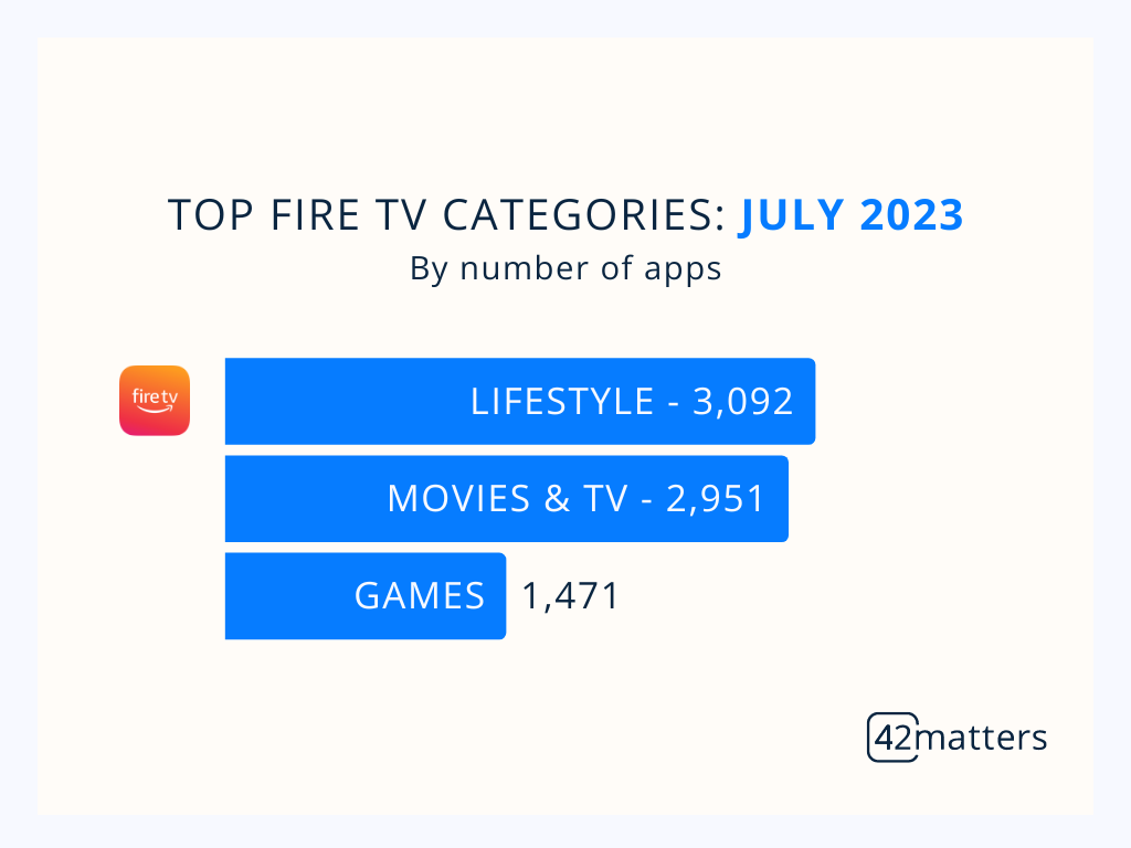 ‘Lifestyle’, meanwhile, takes the top spot on Fire TV, with 3,092 apps. It’s followed by ‘Movies & TV’ (2,951) and ‘Games’ (1,471).
