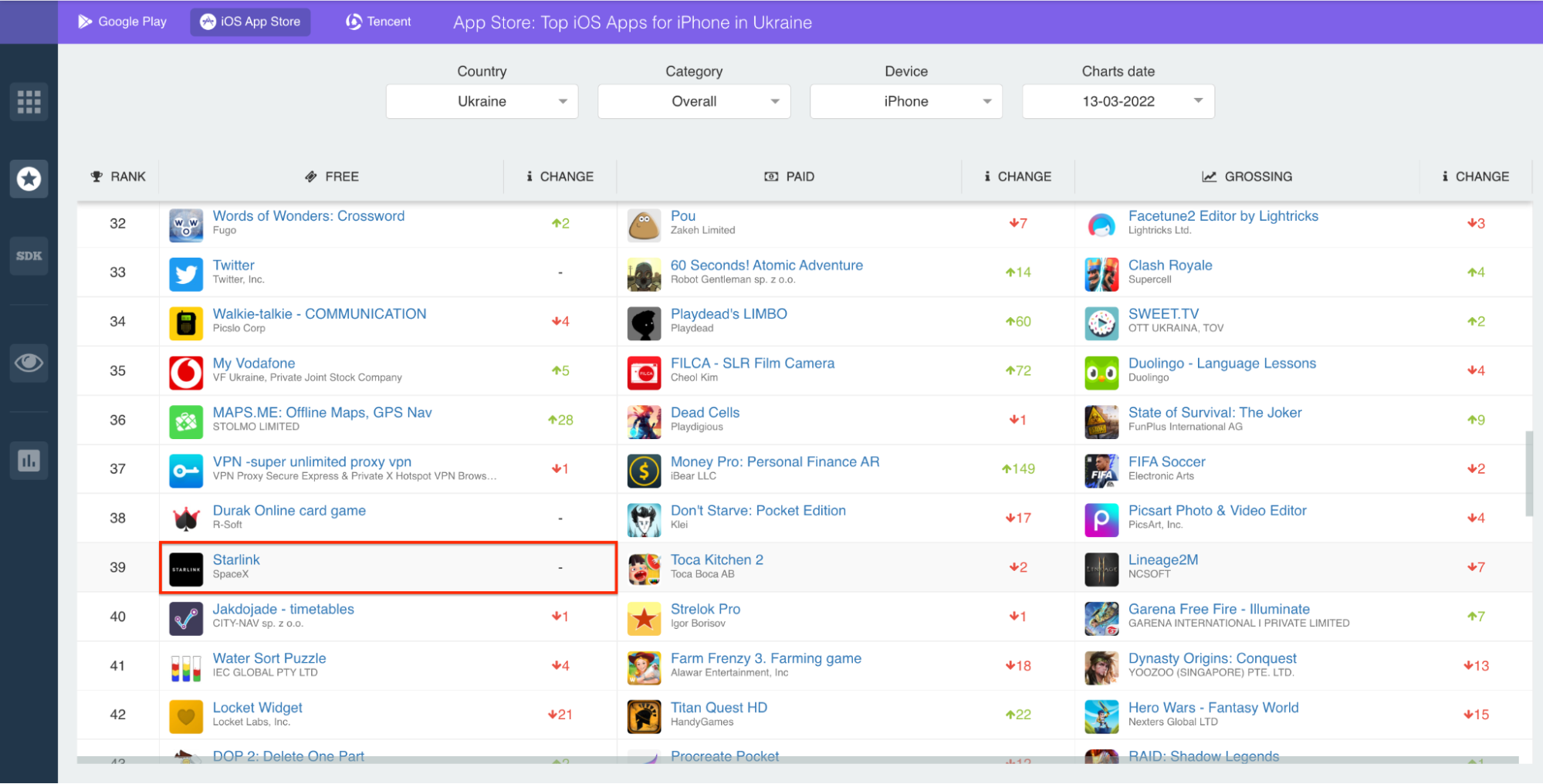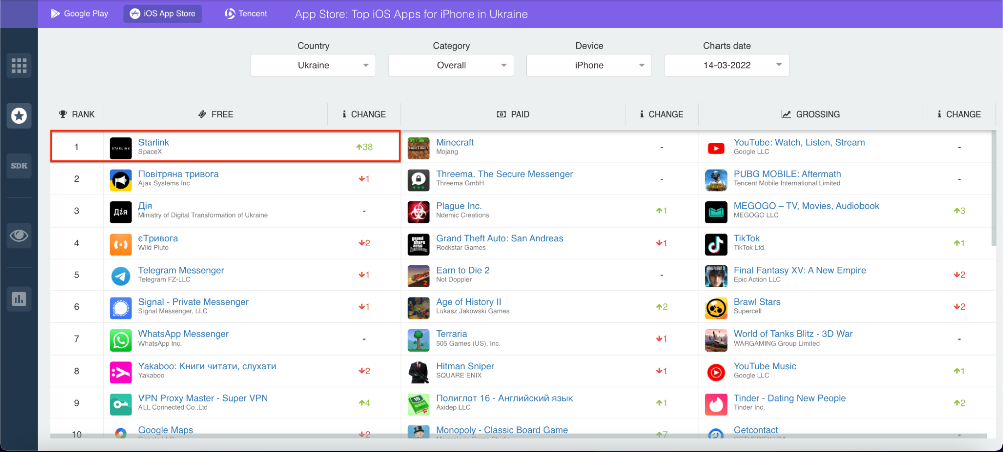 Since the initial shipment of Starlink arrived in Ukraine, the app has been making its way to the top of the country’s app markets. Check it out, here are the overall top charts for iOS apps in Ukraine on March 14th, 2022: