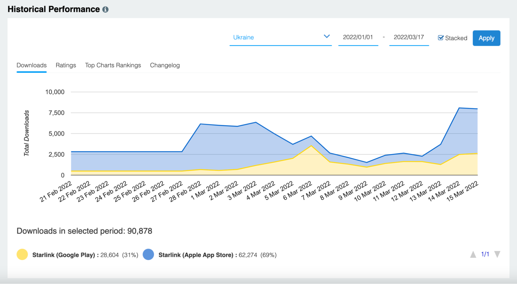In total, Ukranians downloaded Starlink 90,878 times in the period charted above. This includes 62,274 iOS downloads and 28,604 Android downloads.