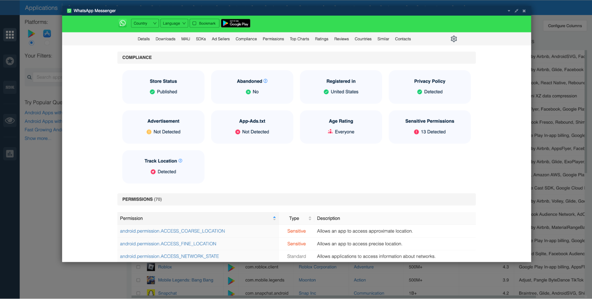 - Track Location: See whether users of an app are required to agree to location tracking (fine location, coarse location, etc.).