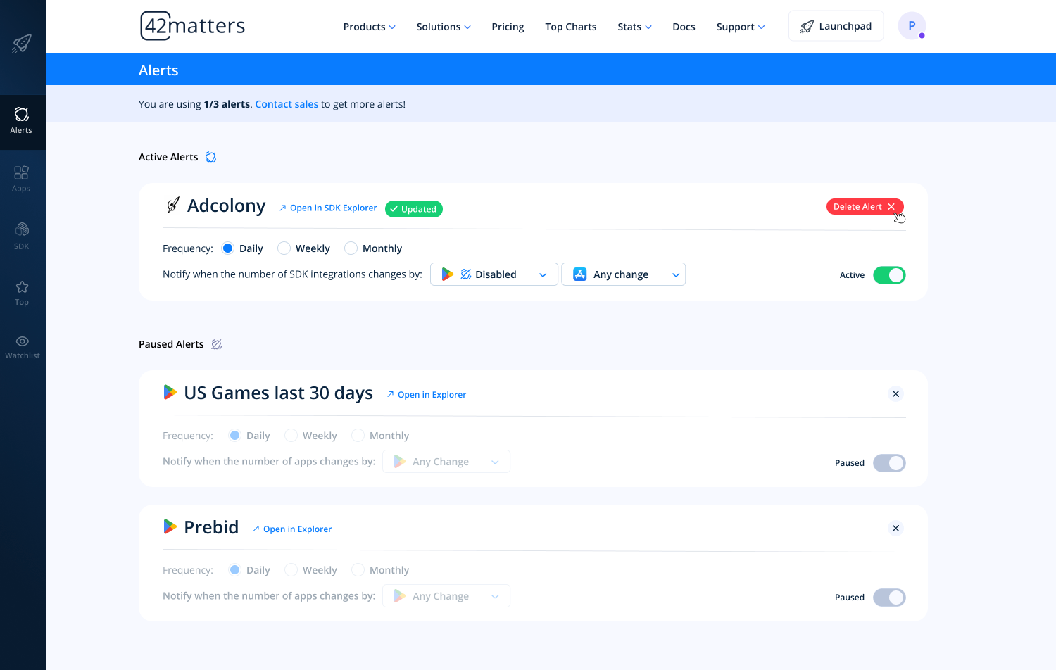 We’re adding a new feature to both the 42matters Explorer and SDK Explorer! With ‘Alerts’ you’ll be able to set up automatic email notifications with updates on specified app queries or SDKs.