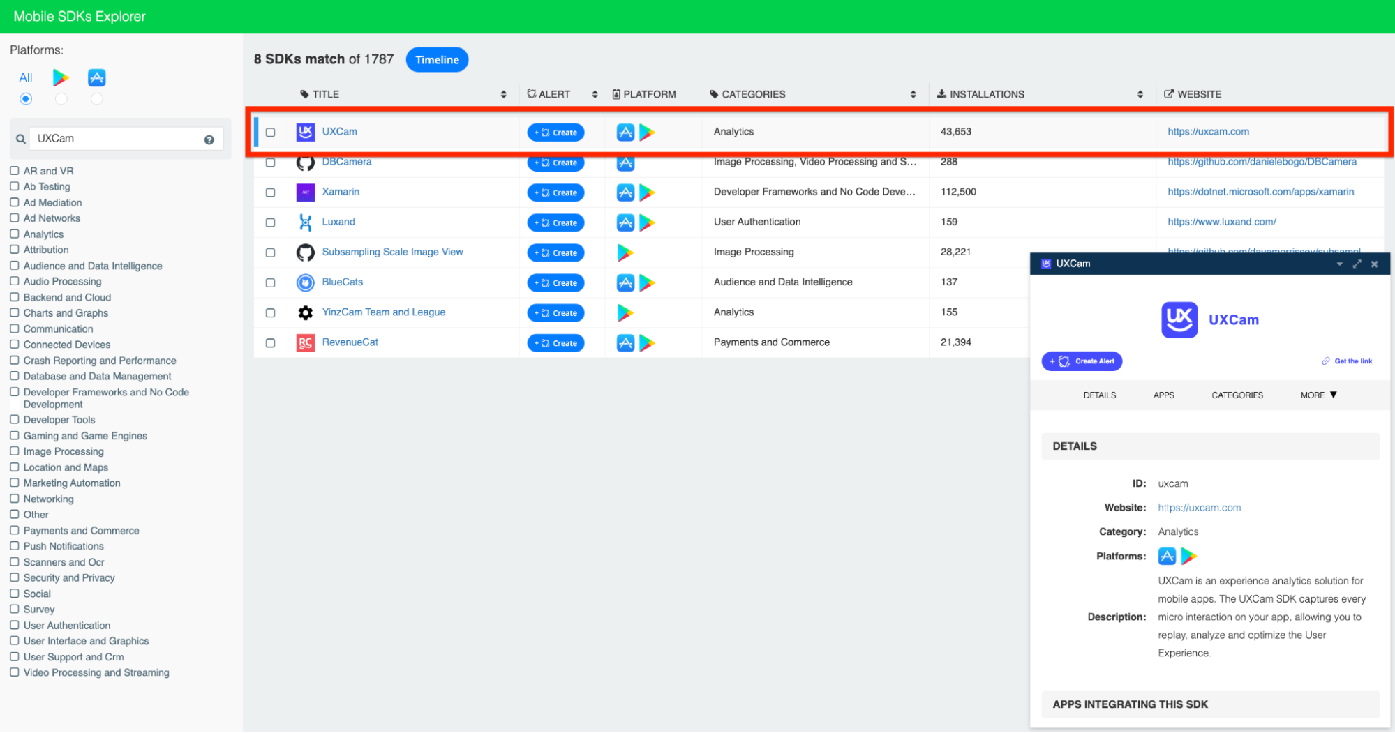 The SDK Explorer enables you to track the performance and market penetration of thousands of iOS and Android SDKs across dozens of SDK categories. So, if you run a mobile ad network, you can use the SDK Explorer to keep an eye on competitors in the mobile Ad Tech space.