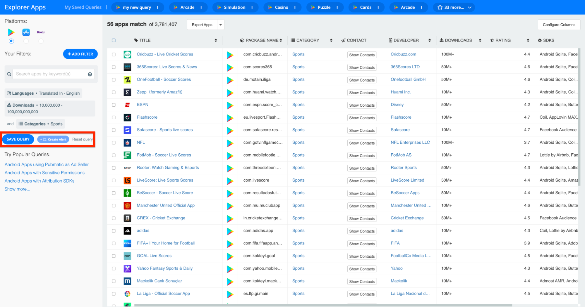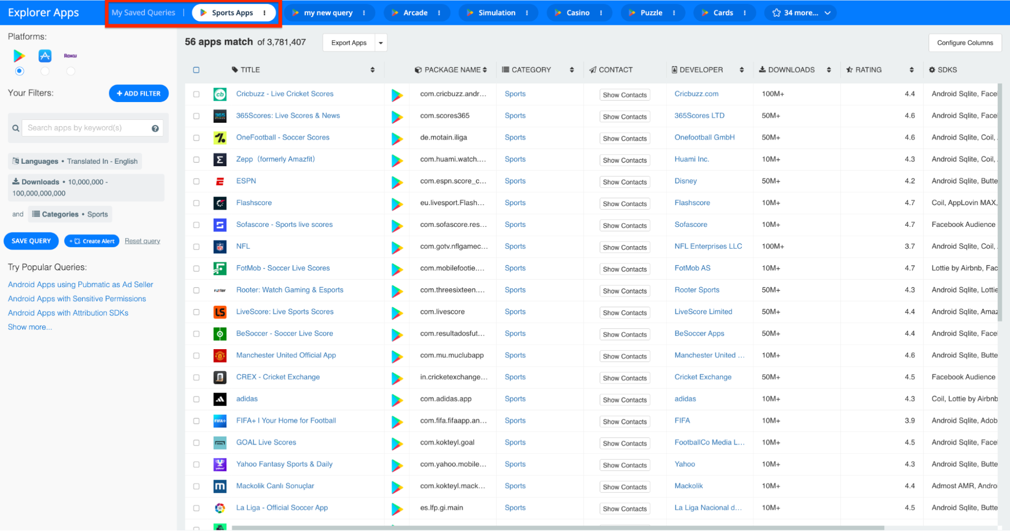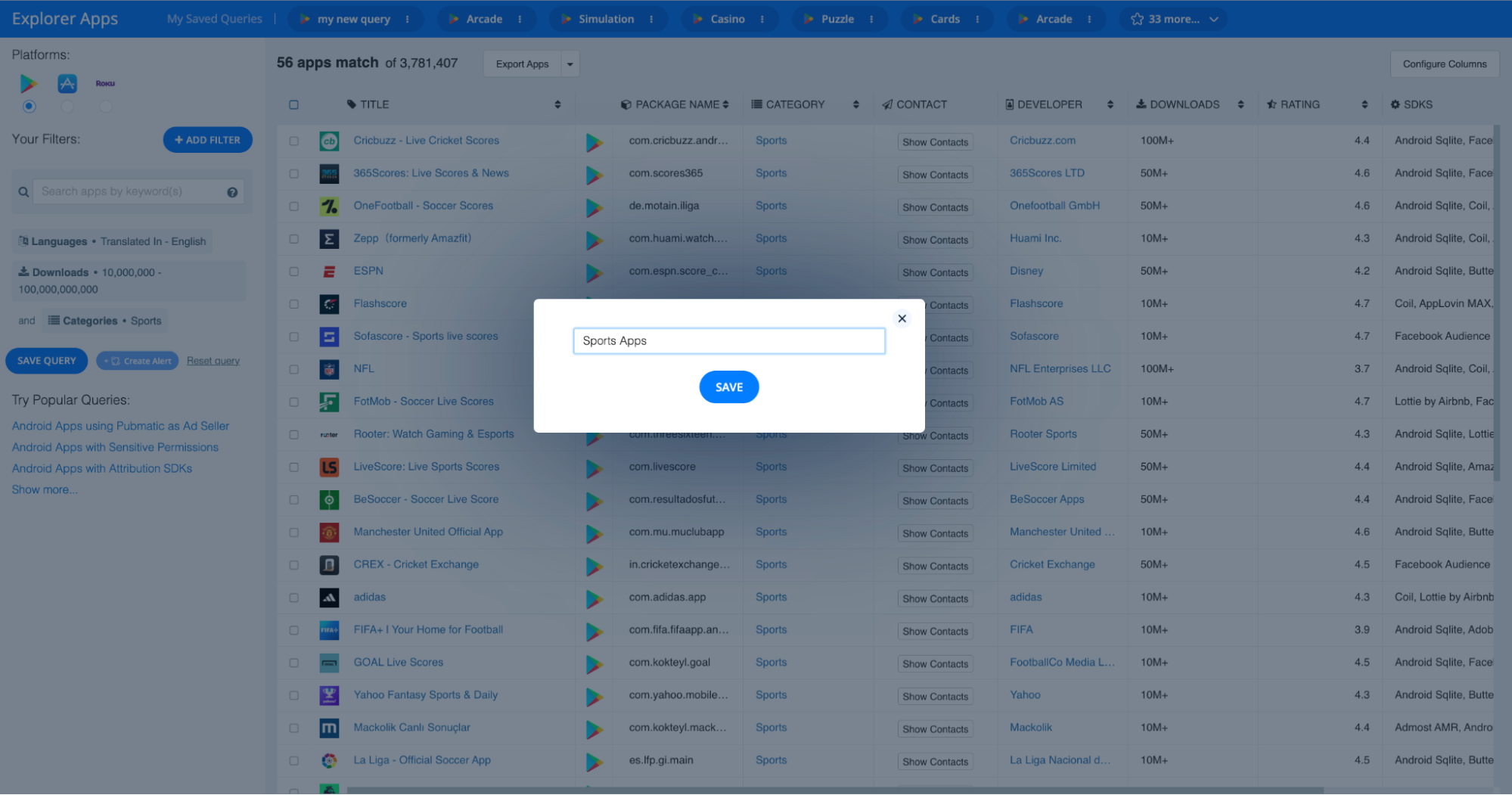 In order to save a query in the 42matters Explorer, launch the platform and adjust the various filters and sorting features according to your preferences. In the example below, we’ve searched for all Android ‘Sports’ apps available in English with at least 10,000,000 downloads.