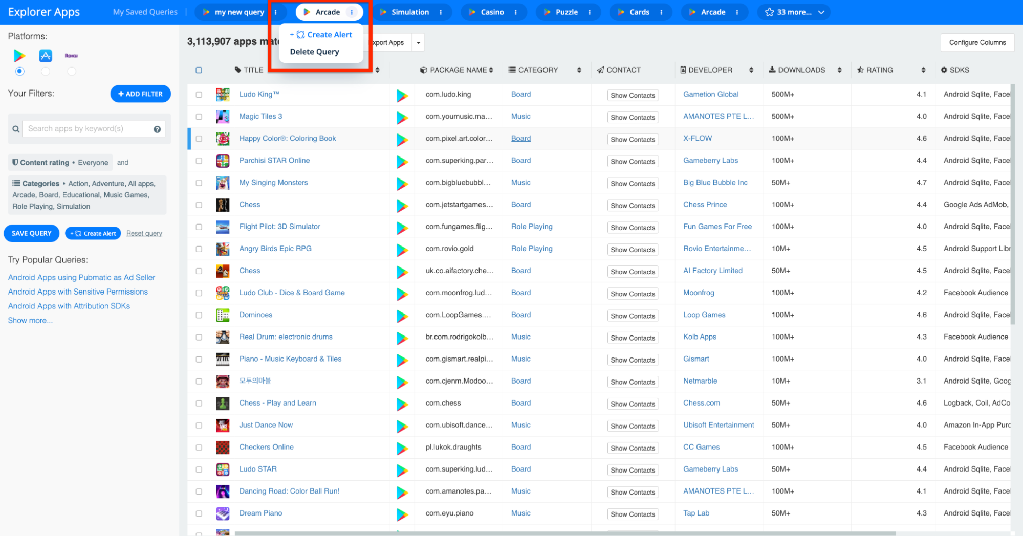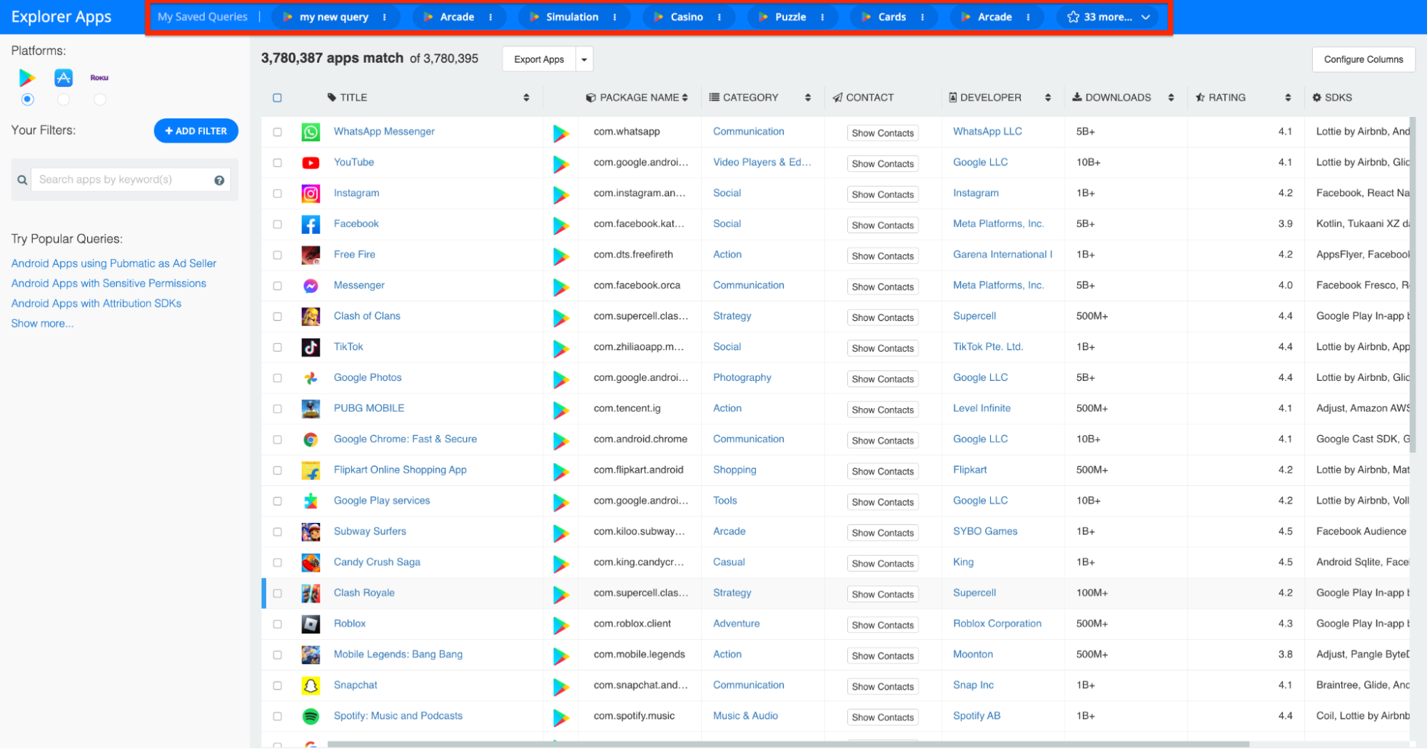 To give you a concrete example, if you work for a company that develops mobile SDKs for iOS games, you can save a query in the Explorer that yields all mobile games that use your competitors’ SDKs. Then, any time you’d like to benchmark against their market penetration or launch a campaign to win over their user base, you can pull up the query in the Explorer with a single click.