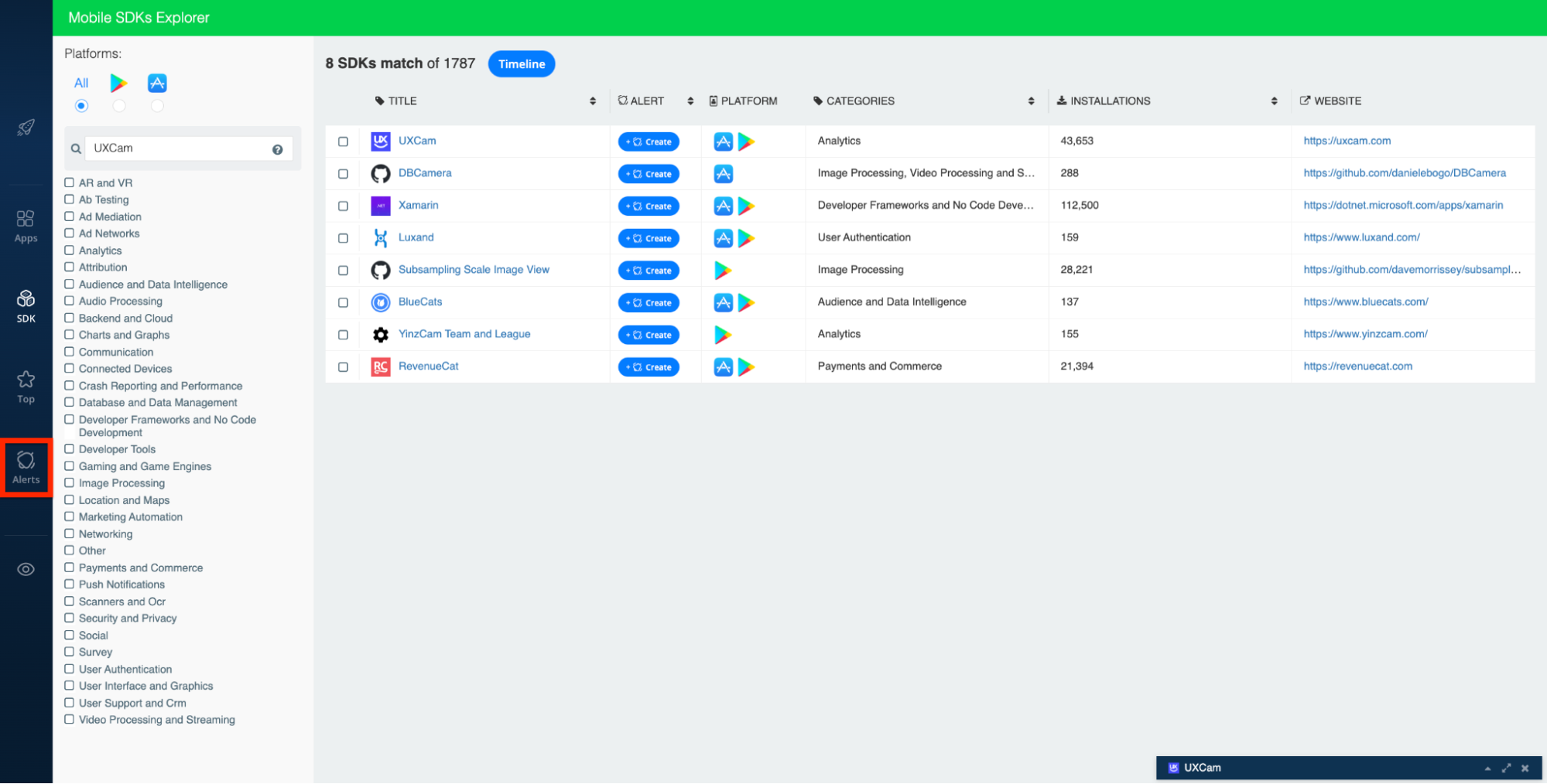 Alerts are particularly great for mobile app developers, SDK developers, and ad networks. They enable these businesses to spot important changes to apps of interest (for example: newly added or removed SDKs, updates to required permissions, developer updates, etc.), identify new competitors, and generate highly-segmented app developer leads.