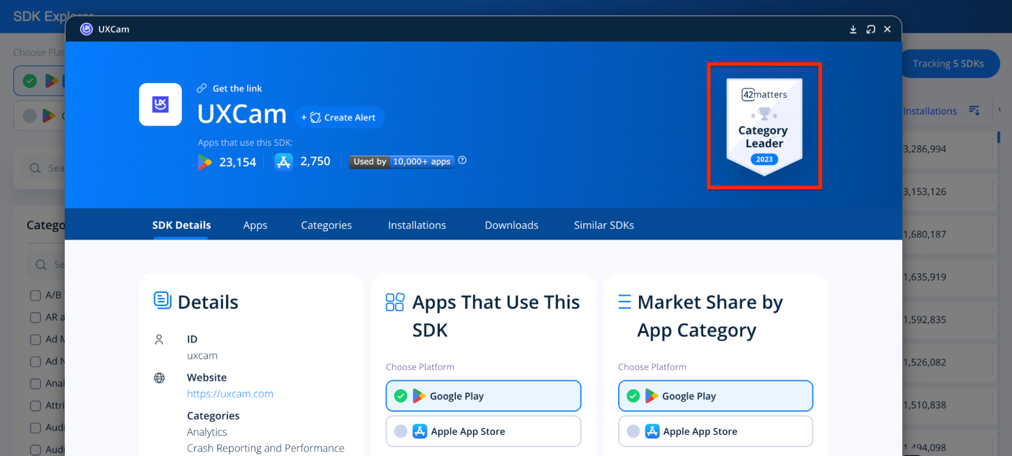 As with the Performance Badges, SDK Installation Badges can be found in the 42matters SDK Explorer on the winning SDKs’ profiles: