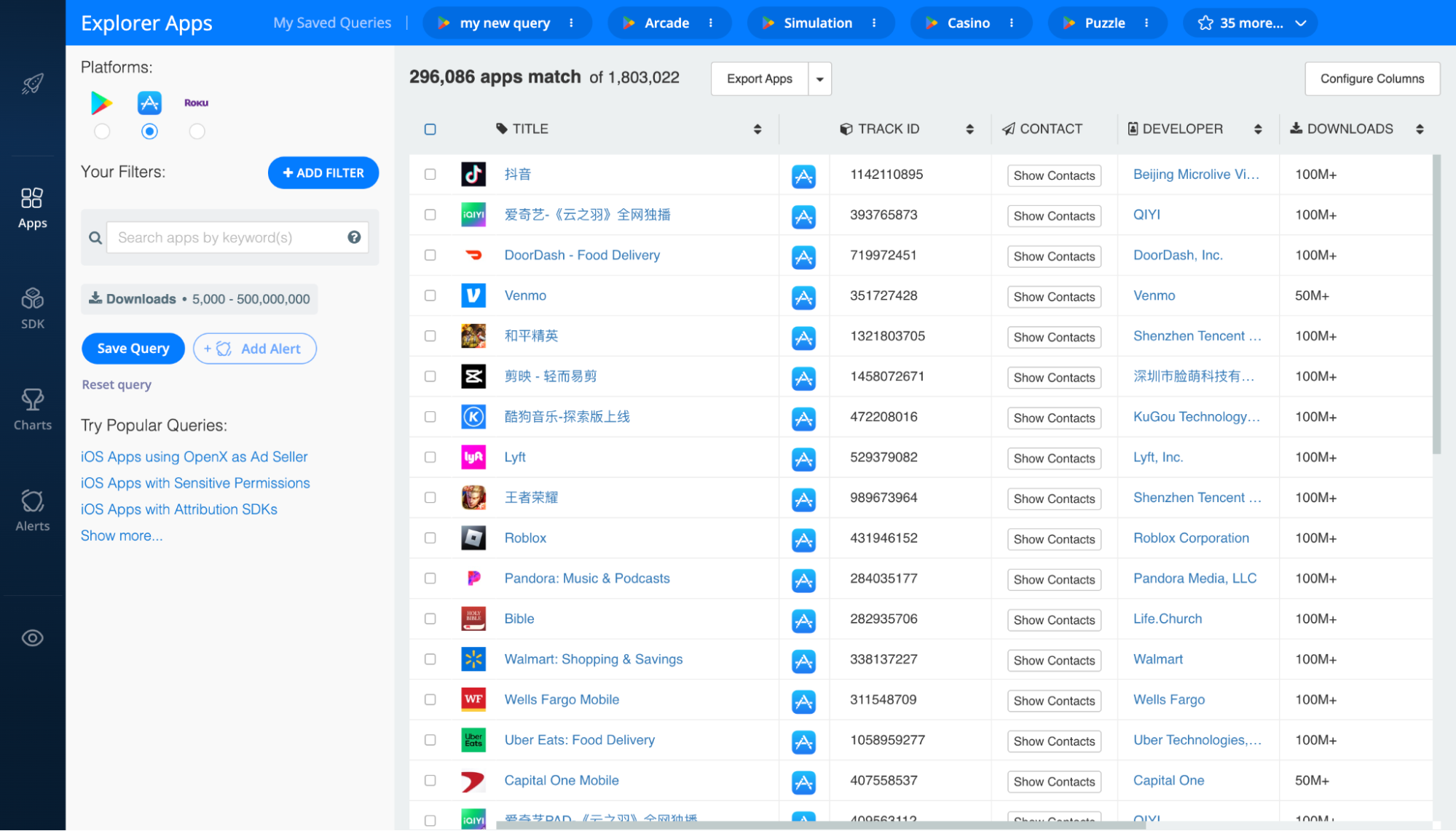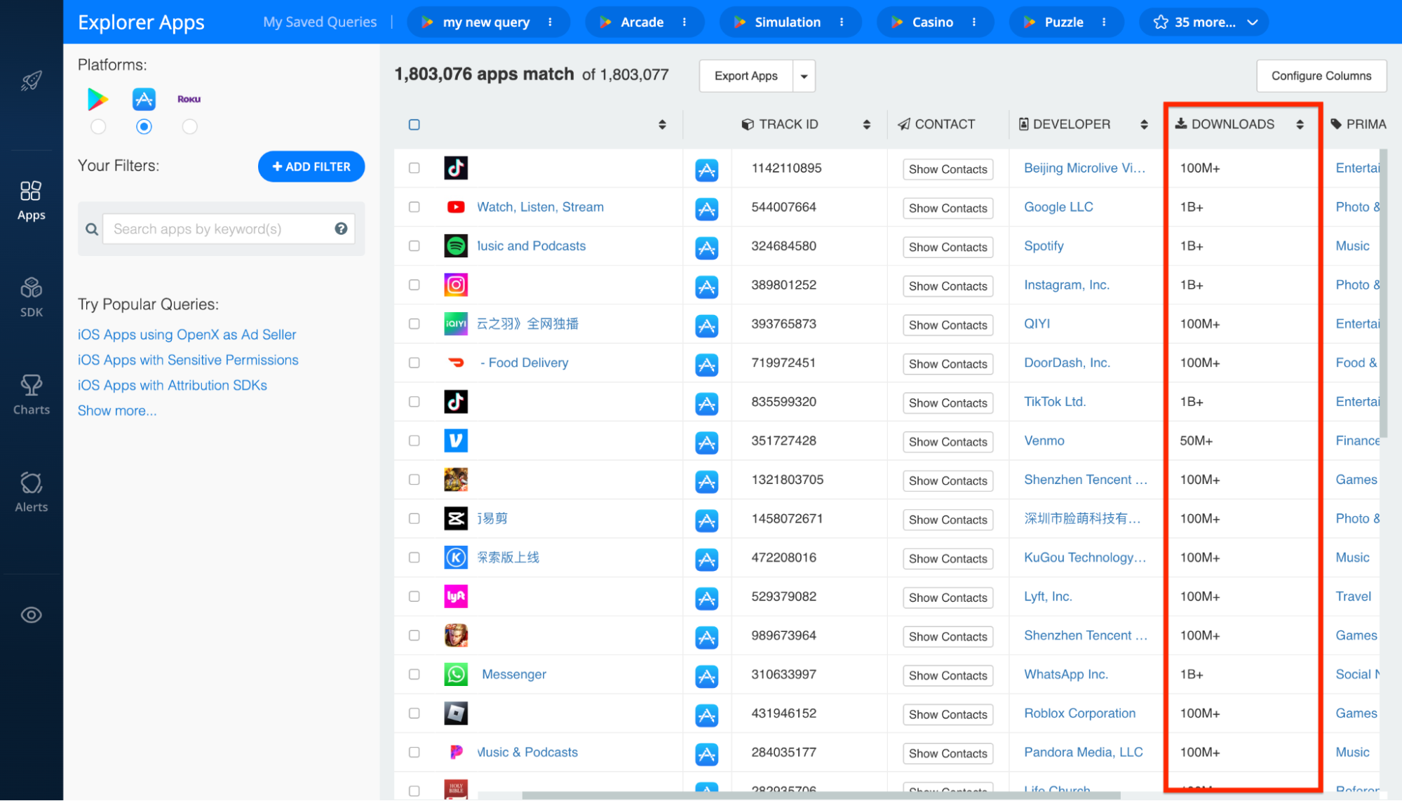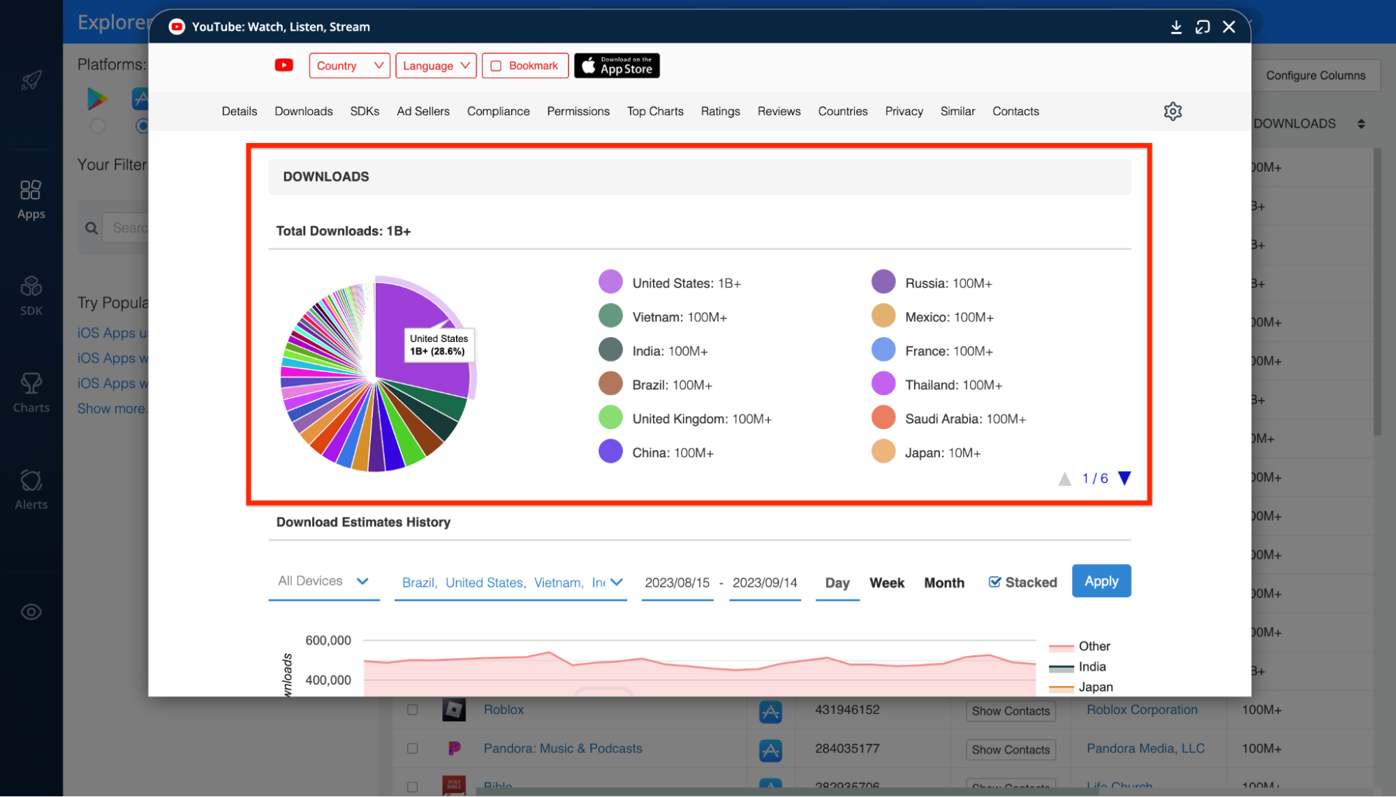 We’ve added four new features and functionalities! First, we added total iOS downloads and total downloads by country to the Explorer. We also added a downloads field to the iOS Lookup API. Finally, we enhanced the iOS Advanced Query API with downloads_gte and downloads_lte. Let’s look at these one at a time.