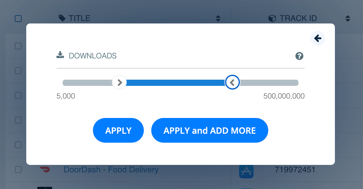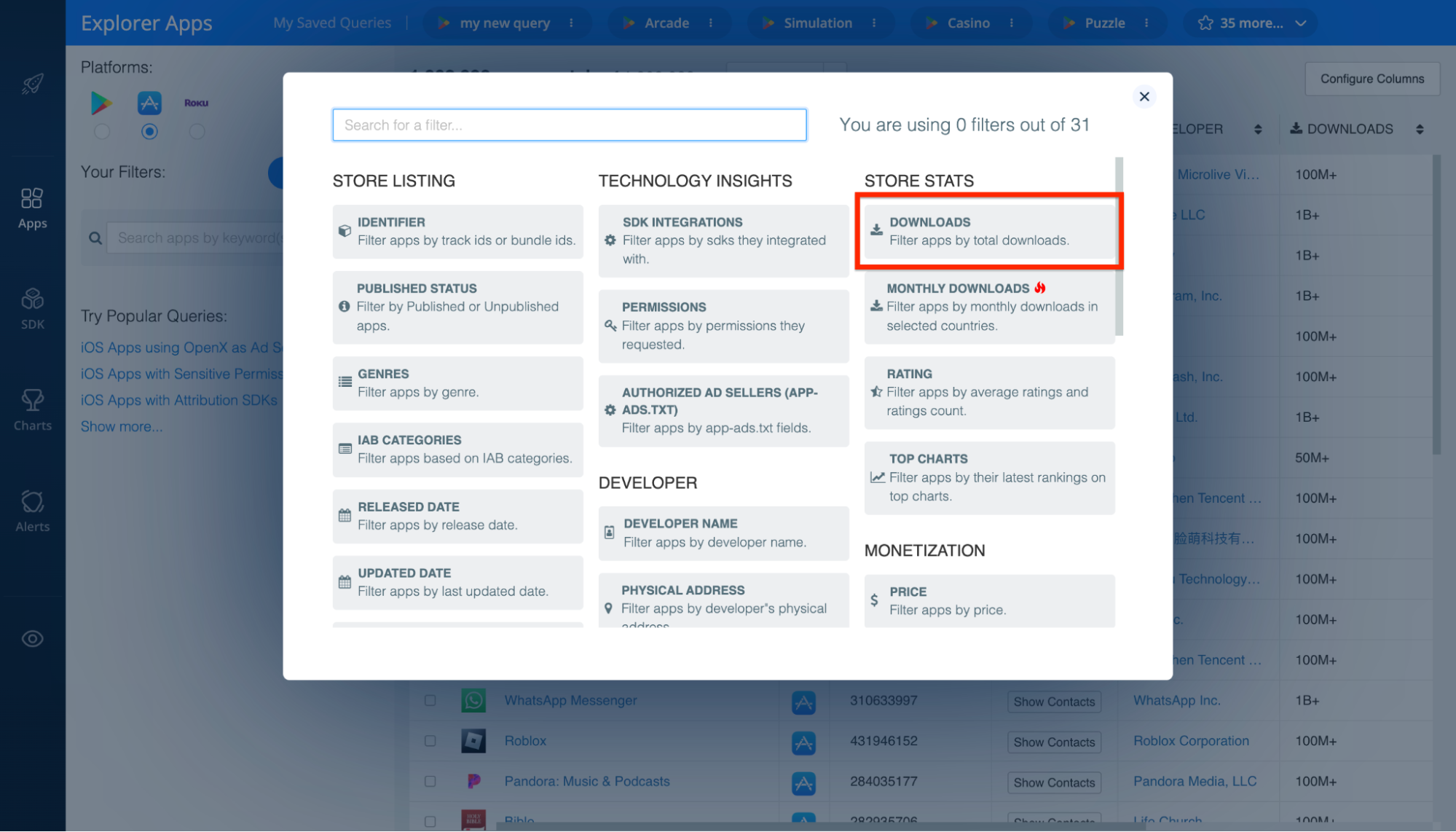 In addition, you can use the Explorer’s filters to zero in on apps with a specified range of downloads. To do this, simply click the + ADD FILTER button and select DOWNLOADS underneath STORE STATS: