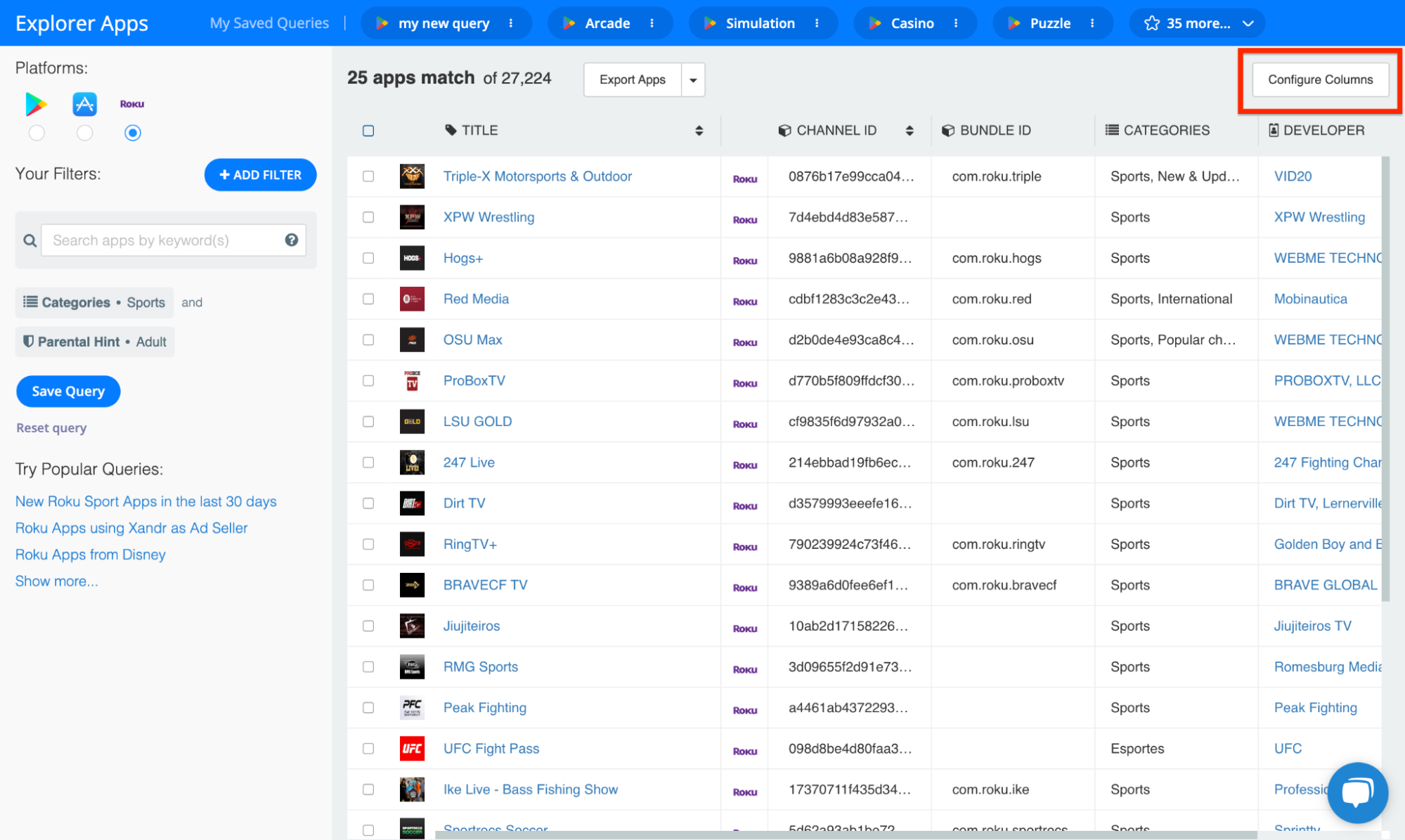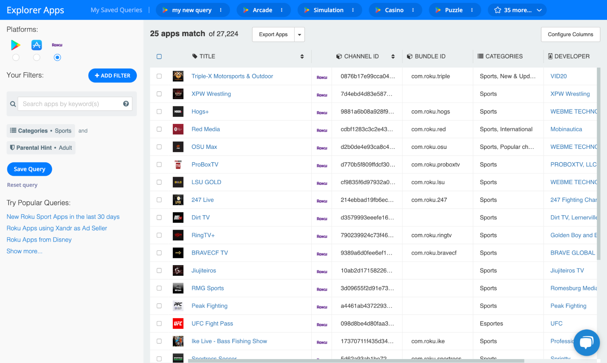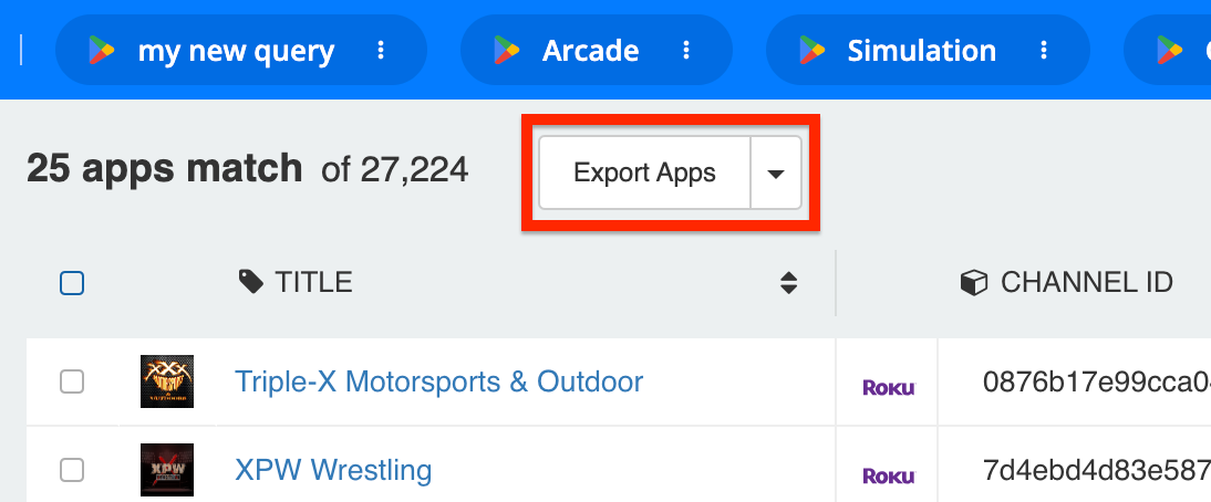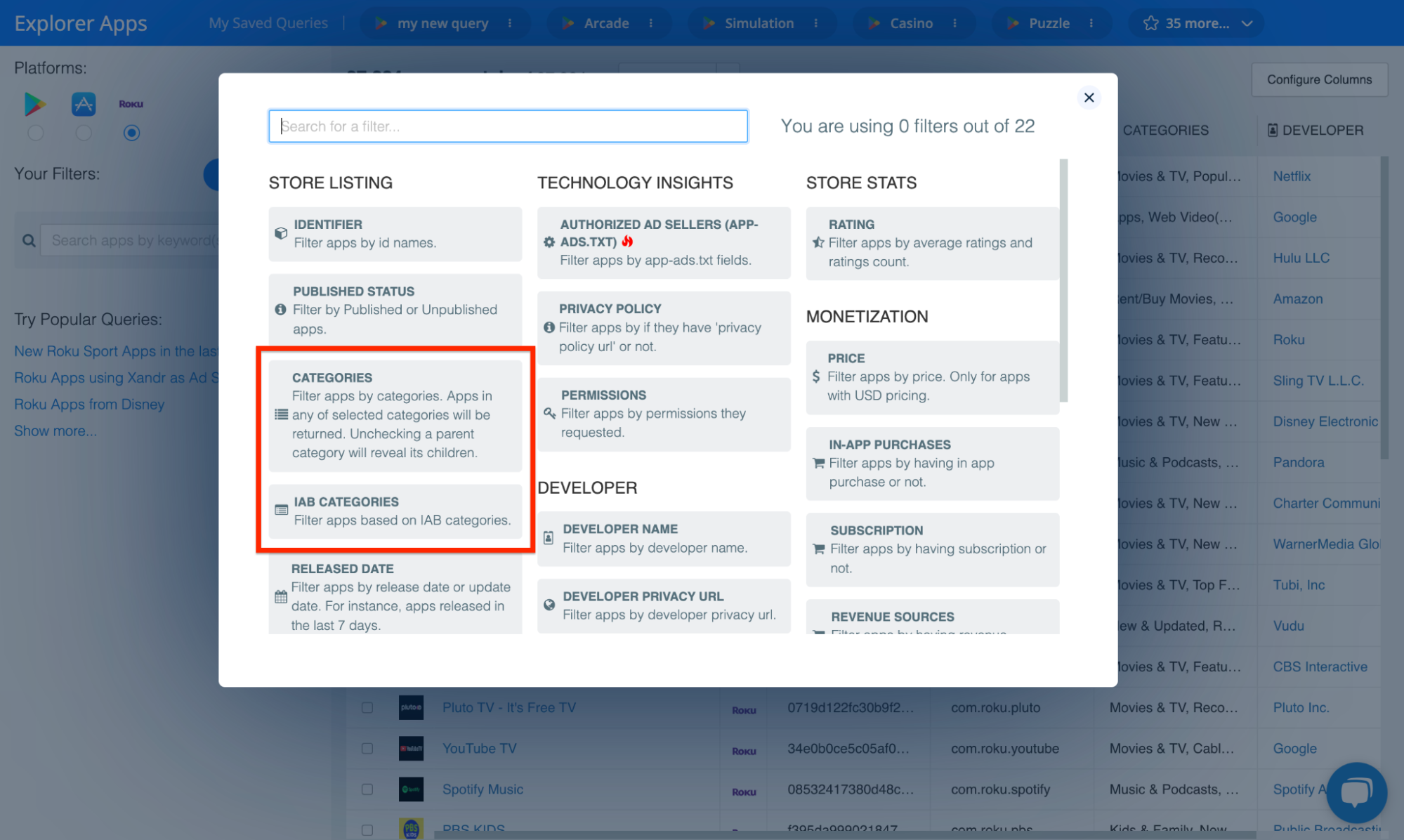 In this case, 25 Roku apps match our specific query. However, you can use the Explorer’s 20+ filters to expand and narrow your query as you see fit.