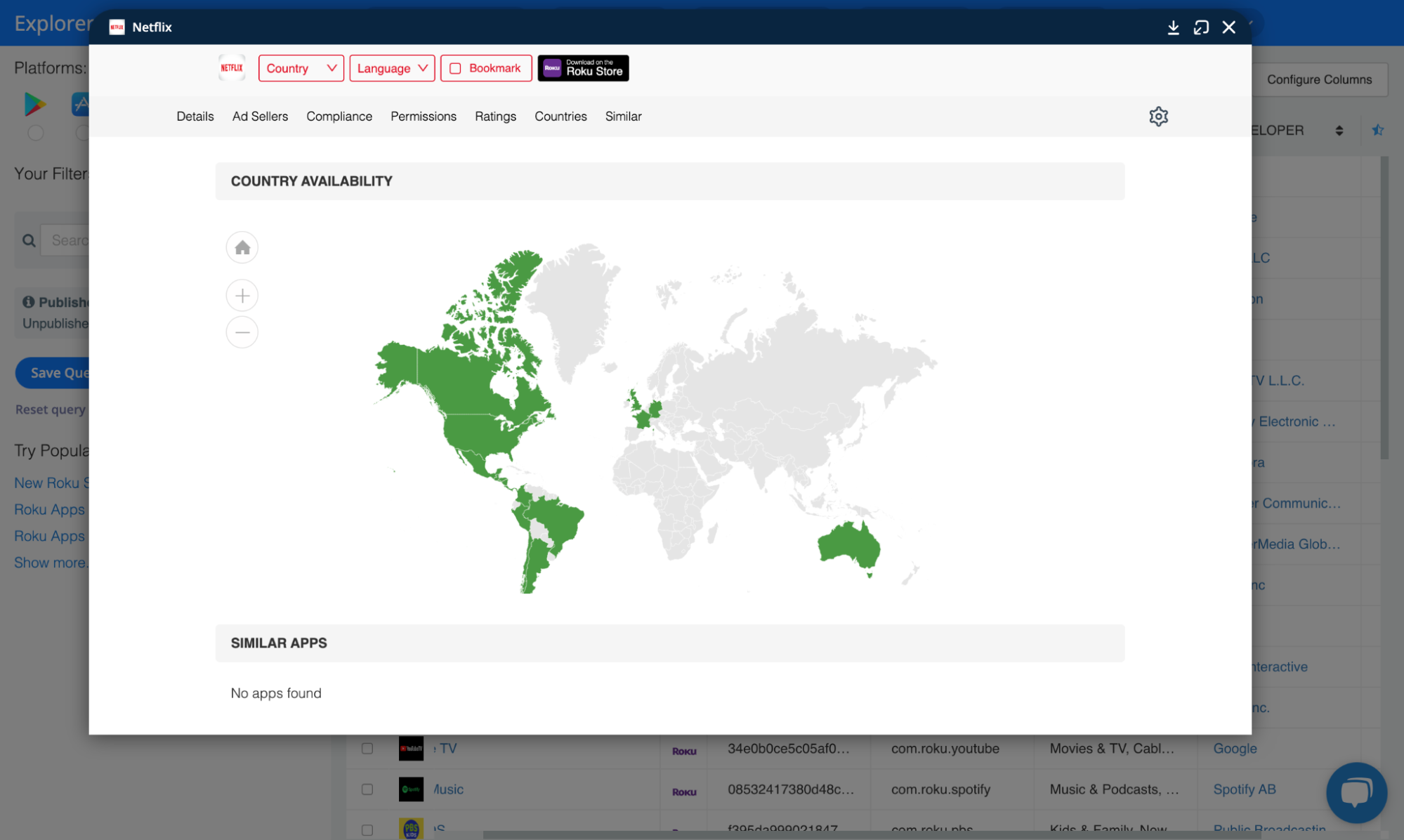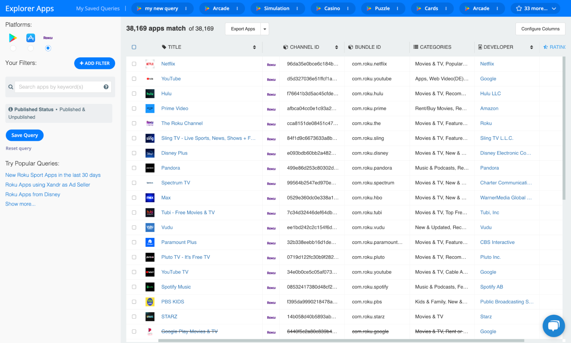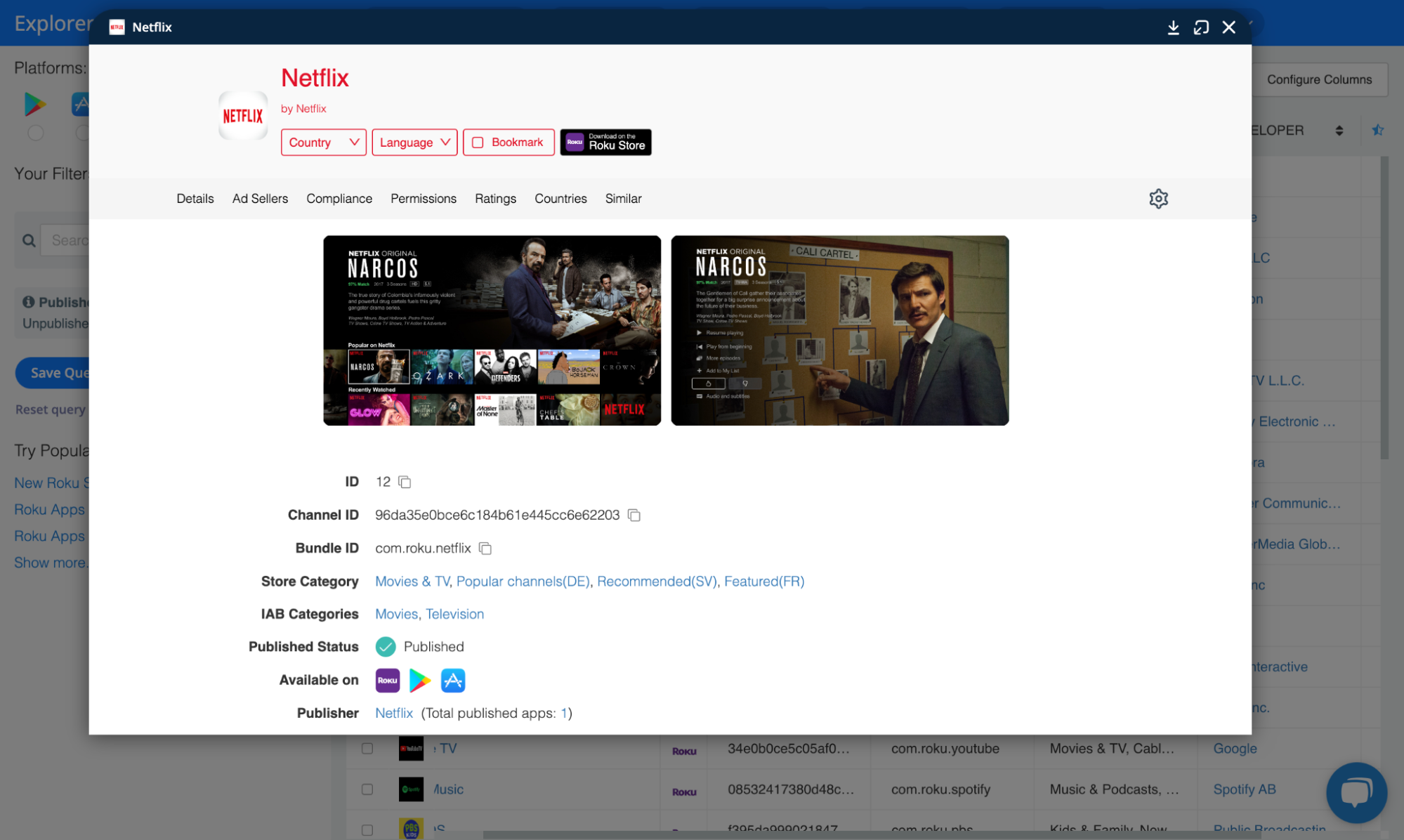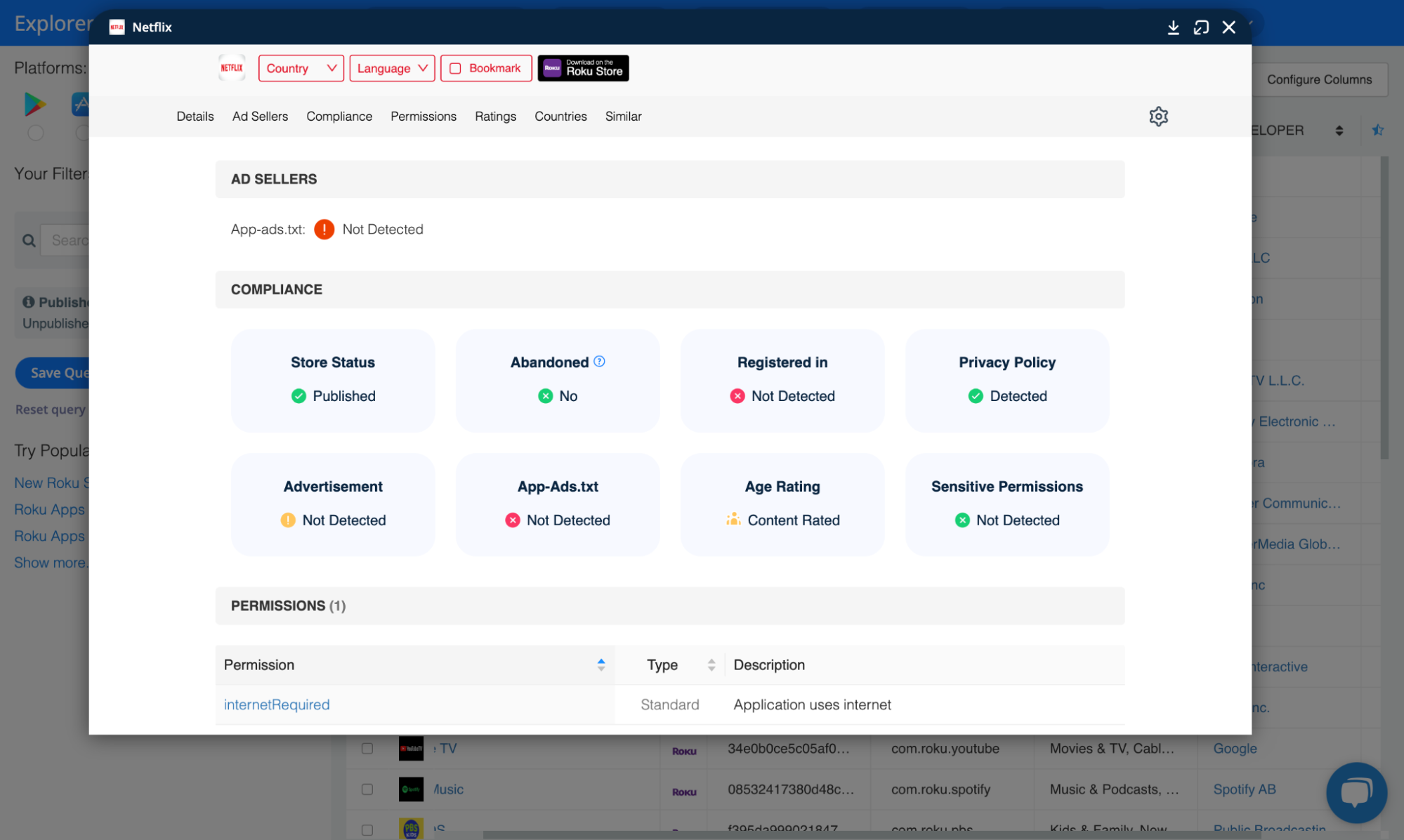 Regarding Roku, the Explorer provides information on over 38k published and unpublished Roku apps from more than 10k Roku publishers. For every app, you can view developer information, app identifiers such as Channel ID and Bundle ID, classification details like Category and IAB Category, performance indicators like Rating Counts, insights on app-ads.txt and other compliance aspects, and much more.