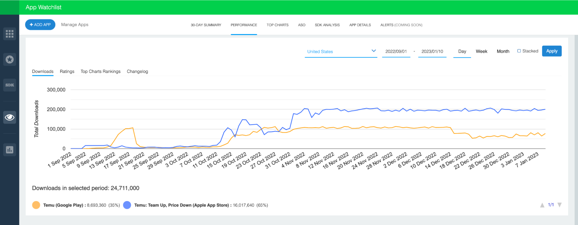 The chart above depicts daily downloads for the Android (orange) and iOS (blue) versions of Temu since their release in September of 2022.