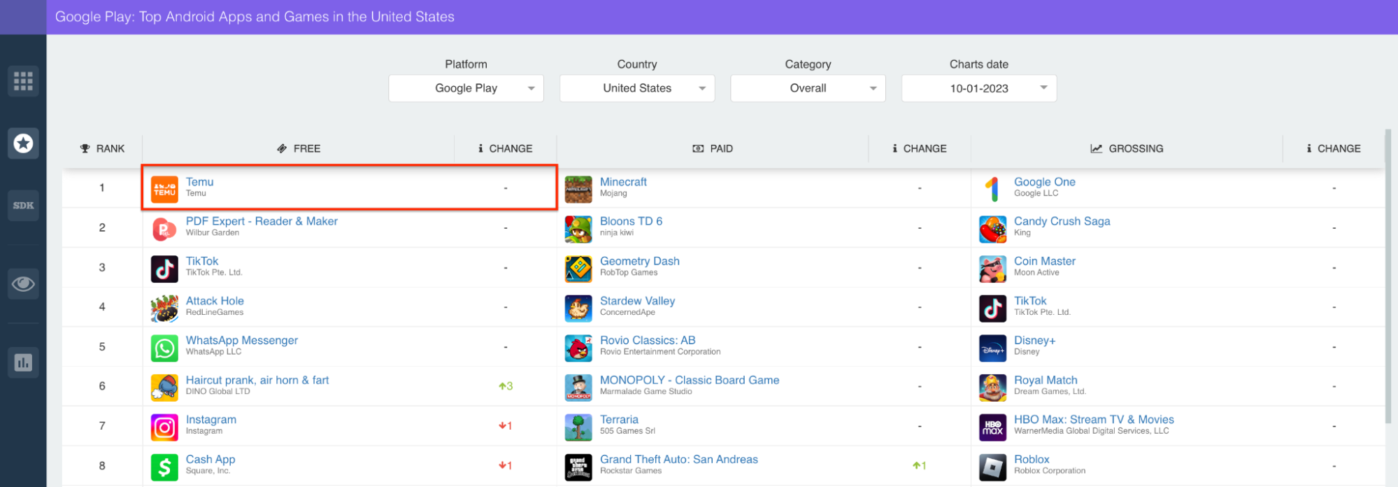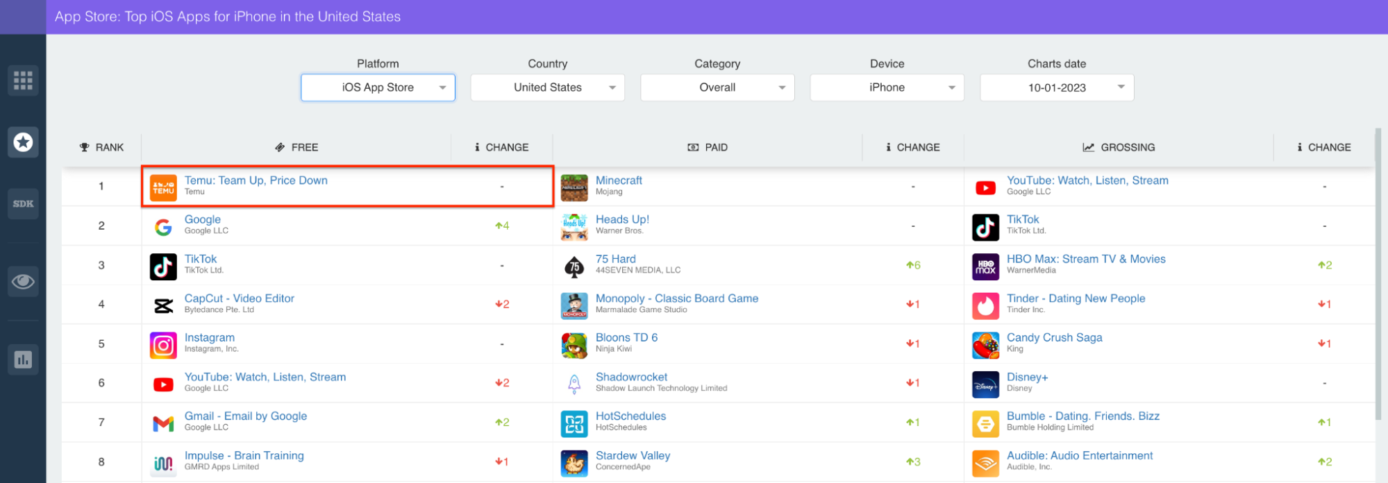 However, Temu dominates far more than the shopping category. As noted above, Temu is the top ranked app in the United States, overall! Check it out: