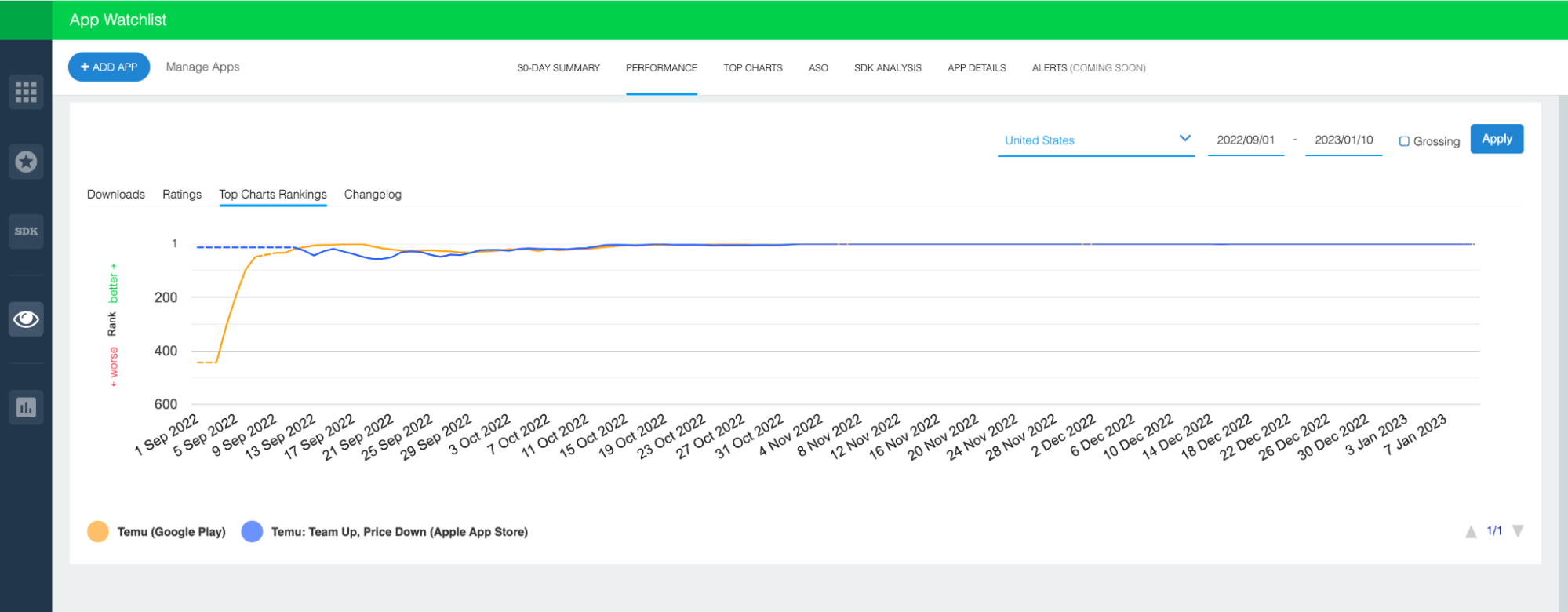 So, with this in mind, we dug into the details. We analyzed Temu’s performance on Google Play and the Apple App Store, focusing on downloads, top chart rankings, and monthly active users (MAU).