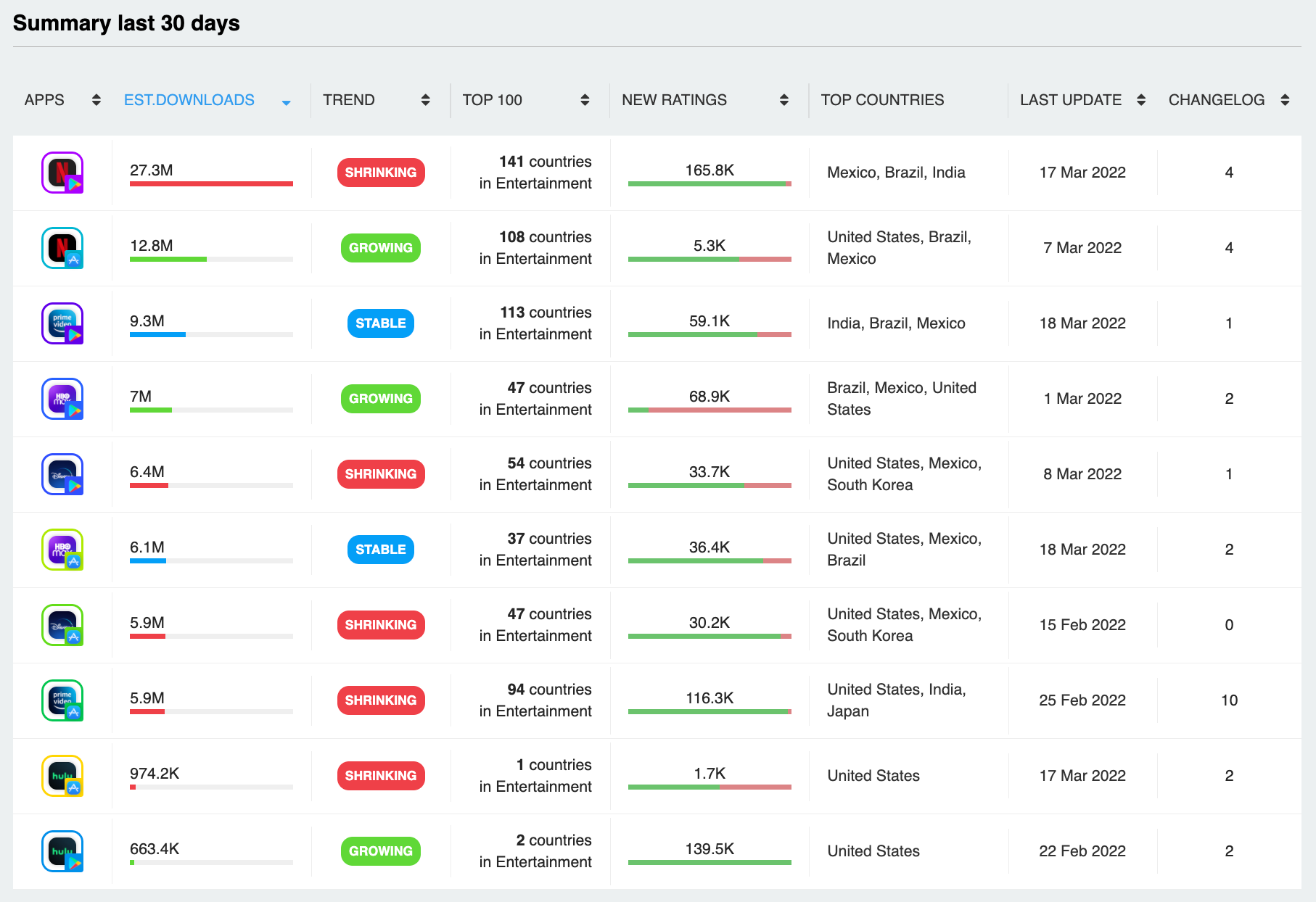 As an aside, it’s not clear what drove the March 6th spike. However, a quick Google search does reveal that that was the day Netflix shut down its services in Russia. Perhaps that press was good enough to lift the entire streaming world. In any case, let’s move on to the iOS apps…