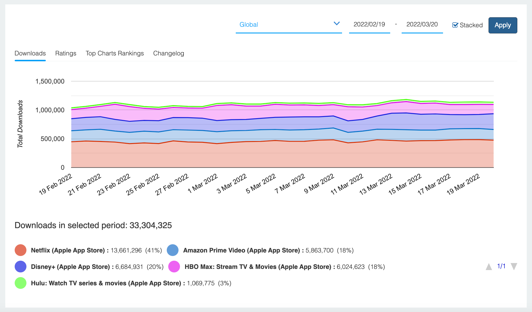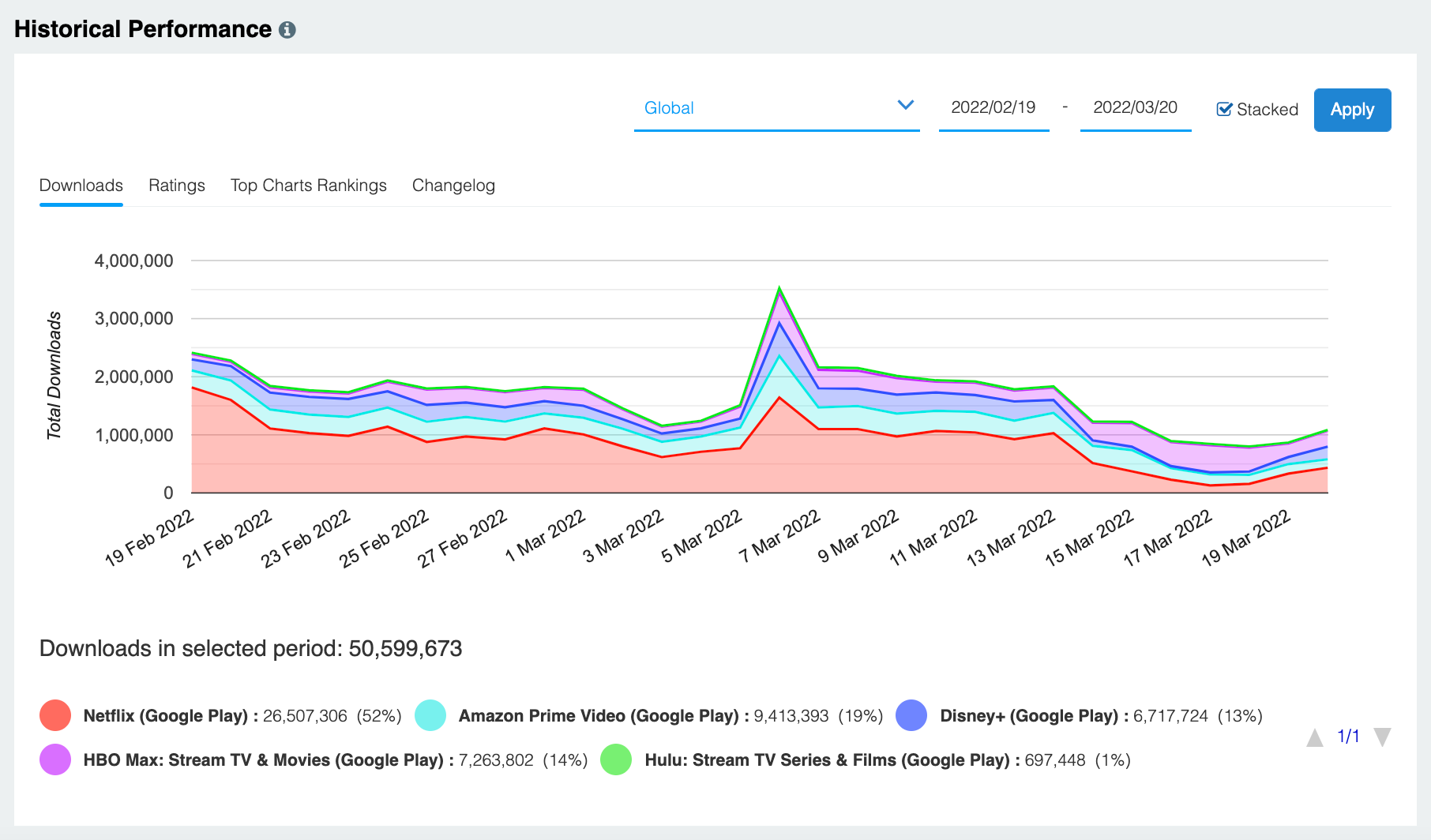 Above you’ll find daily global downloads for the Android versions of the top five streaming platforms — Netflix, Amazon Prime Video, Disney+, HBO Max, and Hulu. In particular, this chart depicts global downloads between February 19th, 2022 and March 20th, 2022.