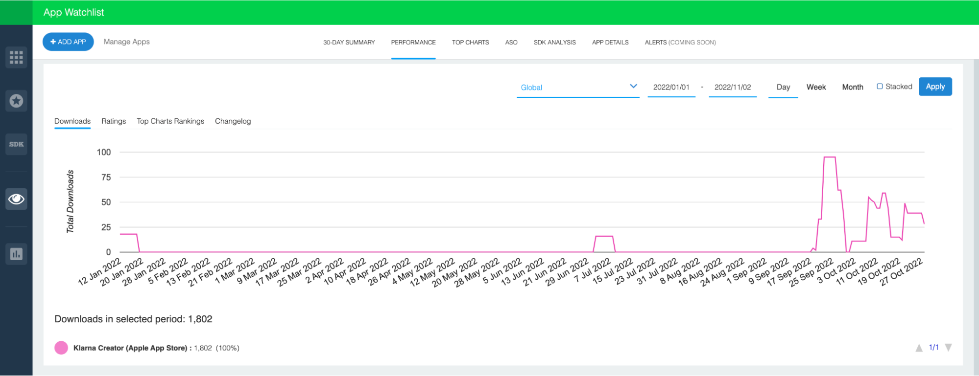 In any event, as the chart demonstrates, Klarna Creator has been downloaded 1,802 times since January 2022. The vast majority of these downloads occurred in mid September, after the app rebranded to Klarna Creator.