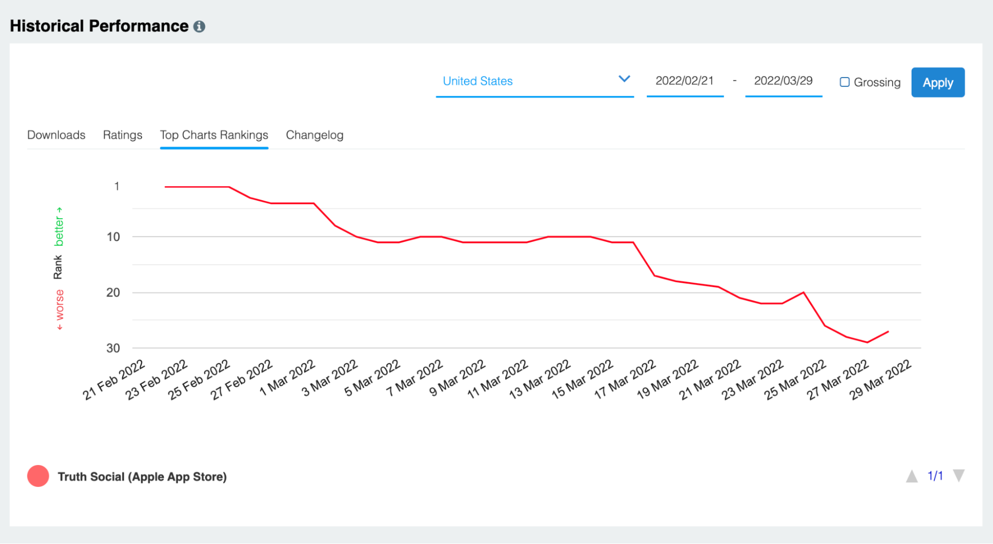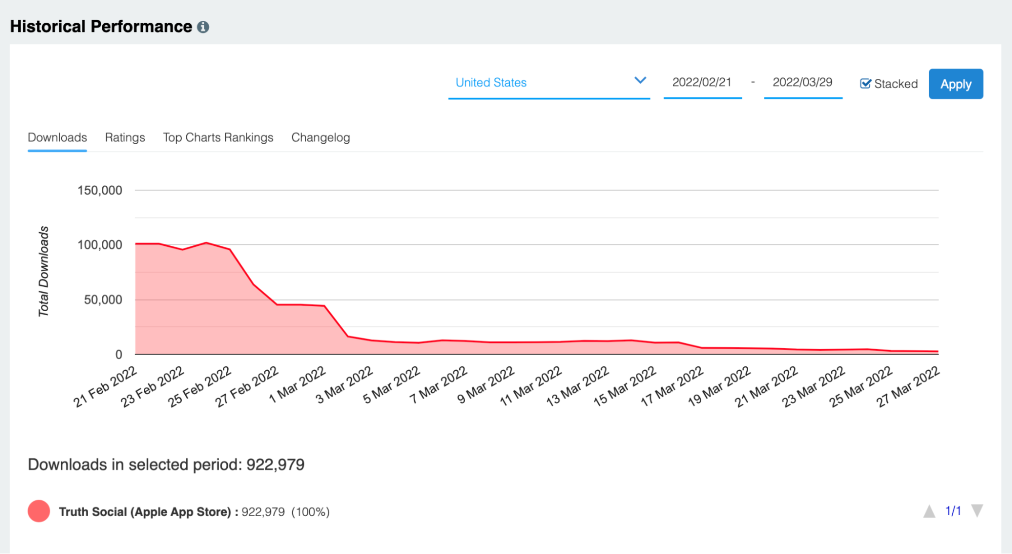 Donald Trump launched Truth Social on February 21st, 2022. One month later, the app appears to be on life support. We dig into the numbers.