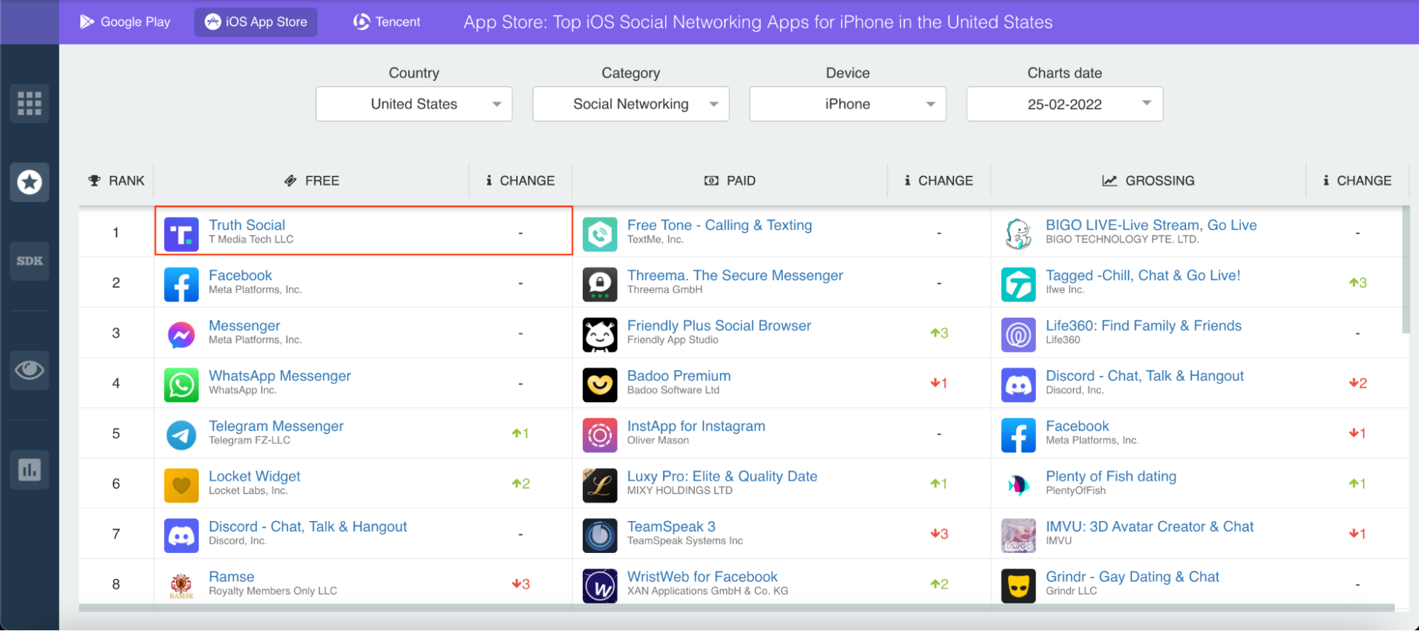 The top chart rankings tell a similar story. Above, you’ll find Truth Social’s daily U.S. rankings in the ‘Social Networking’ genre of the App Store.