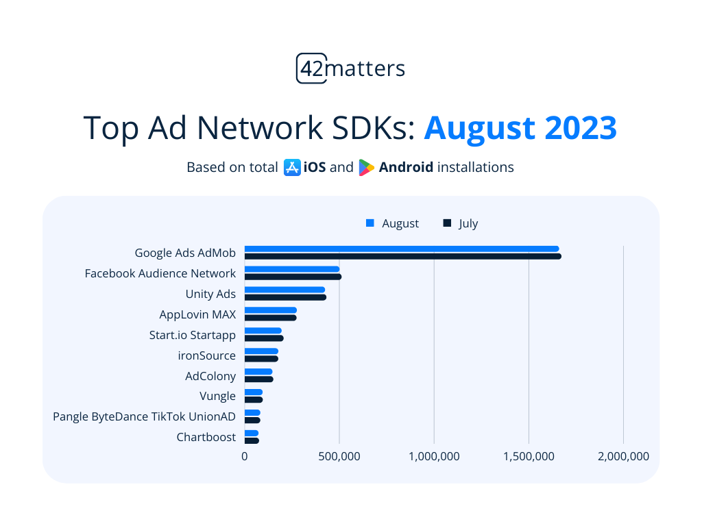 To kick things off, let’s look at where things stand among the top Ad Network SDKs. Google Ads AdMob remains the top option here, with 1,658,309 iOS and Android installations.