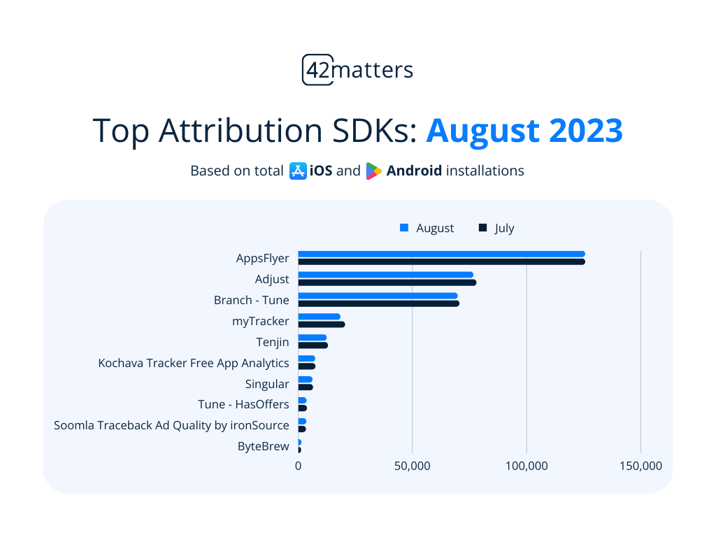 Moving on, let’s look at the top attribution SDKs. Here, AppsFlyer takes the top spot. It’s installed on 125,507 total iOS and Android apps, down a hair from July’s total of 125,531. While this number gives AppsFlyer a healthy lead, competition for the next spot is a little stiffer. In addition, just Soomla and ByteBrew improved upon their July numbers.
