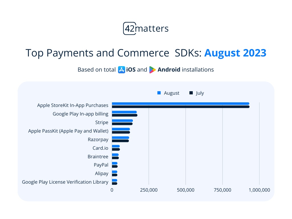 - Apple PassKit (Apple Pay and Wallet): 121,177 installations (July: 121,650)